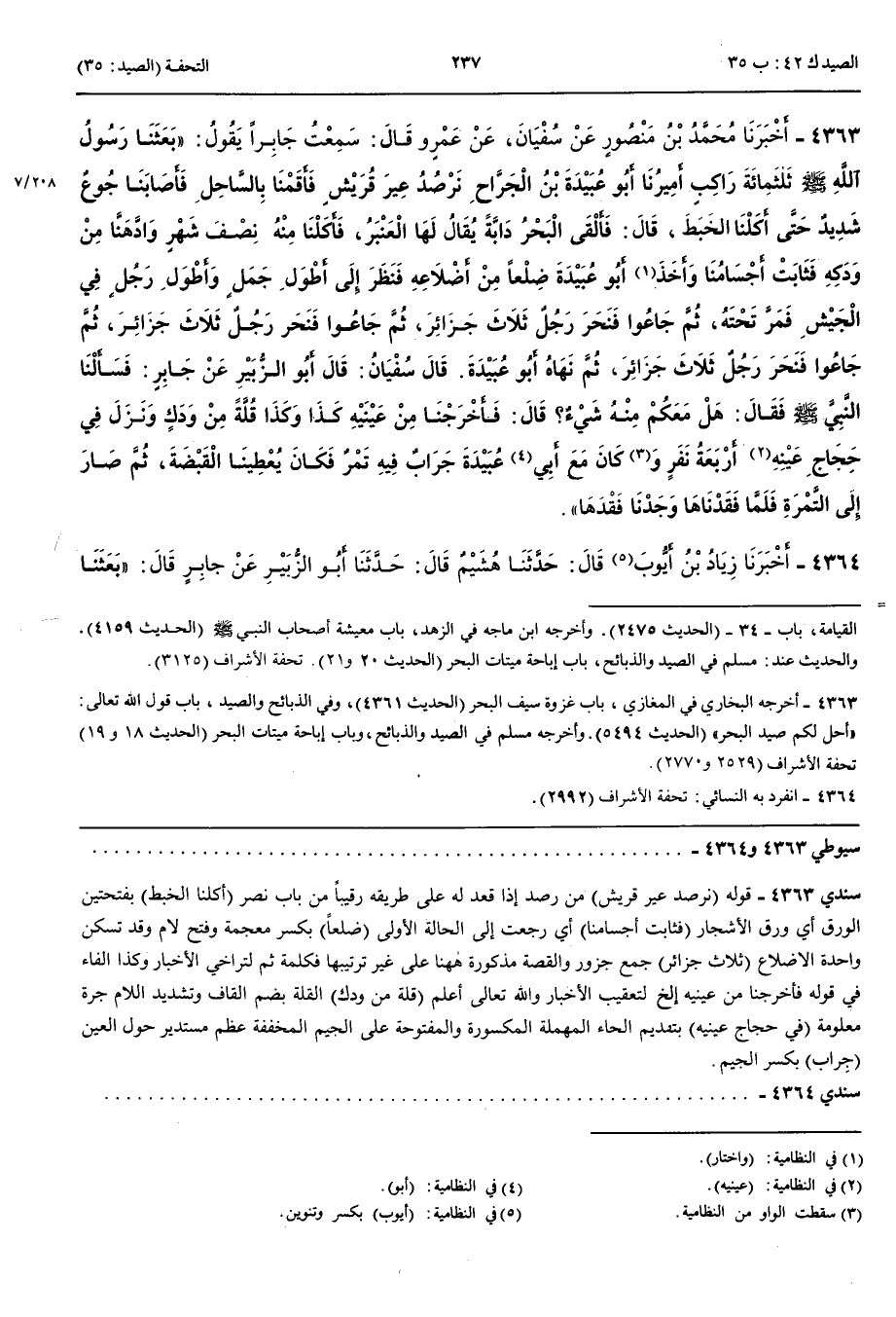 4363 - أَخْبَرَنَا مُحَمَّدُ بْنُ مَنْصُورٍ عَنْ سُفْيَانَ عَنْ عَمْرٍو قَالَ سَمِعْتُ جَابِرًا يَقُولُ بَعَثَنَا رَسُولُ اللَّهِ صَلَّى اللَّهُ عَلَيْهِ وَسَلَّمَ ثَلَاثَ مِائَةِ رَاكِبٍ أَمِيرُنَا أَبُو عُبَيْدَةَ بْنُ الْجَرَّاحِ نَرْصُدُ عِيرَ قُرَيْشٍ فَأَقَمْنَا بِالسَّاحِلِ فَأَصَابَنَا جُوعٌ شَدِيدٌ حَتَّى أَكَلْنَا الْخَبَطَ قَالَ فَأَلْقَى الْبَحْرُ دَابَّةً يُقَالُ لَهَا الْعَنْبَرُ فَأَكَلْنَا مِنْهُ نِصْفَ شَهْرٍ وَادَّهَنَّا مِنْ وَدَكِهِ فَثَابَتْ أَجْسَامُنَا وَأَخَذَ أَبُو عُبَيْدَةَ ضِلْعًا مِنْ أَضْلَاعِهِ فَنَظَرَ إِلَى أَطْوَلِ جَمَلٍ وَأَطْوَلِ رَجُلٍ فِي الْجَيْشِ فَمَرَّ تَحْتَهُ ثُمَّ جَاعُوا فَنَحَرَ رَجُلٌ ثَلَاثَ جَزَائِرَ ثُمَّ جَاعُوا فَنَحَرَ رَجُلٌ ثَلَاثَ جَزَائِرَ ثُمَّ جَاعُوا فَنَحَرَ رَجُلٌ ثَلَاثَ جَزَائِرَ ثُمَّ نَهَاهُ أَبُو عُبَيْدَةَ قَالَ سُفْيَانُ قَالَ أَبُو الزُّبَيْرِ عَنْ جَابِرٍ فَسَأَلْنَا النَّبِيَّ صَلَّى اللَّهُ عَلَيْهِ وَسَلَّمَ فَقَالَ هَلْ مَعَكُمْ مِنْهُ شَيْءٌ قَالَ فَأَخْرَجْنَا مِنْ عَيْنَيْهِ كَذَا وَكَذَا قُلَّةً مِنْ وَدَكٍ وَنَزَلَ فِي حَجَّاجِ عَيْنِهِ أَرْبَعَةُ نَفَرٍ وَكَانَ مَعَ أَبِي عُبَيْدَةَ جِرَابٌ فِيهِ تَمْرٌ فَكَانَ يُعْطِينَا الْقَبْضَةَ ثُمَّ صَارَ إِلَى التَّمْرَةِ فَلَمَّا فَقَدْنَاهَا وَجَدْنَا فَقْدَهَا