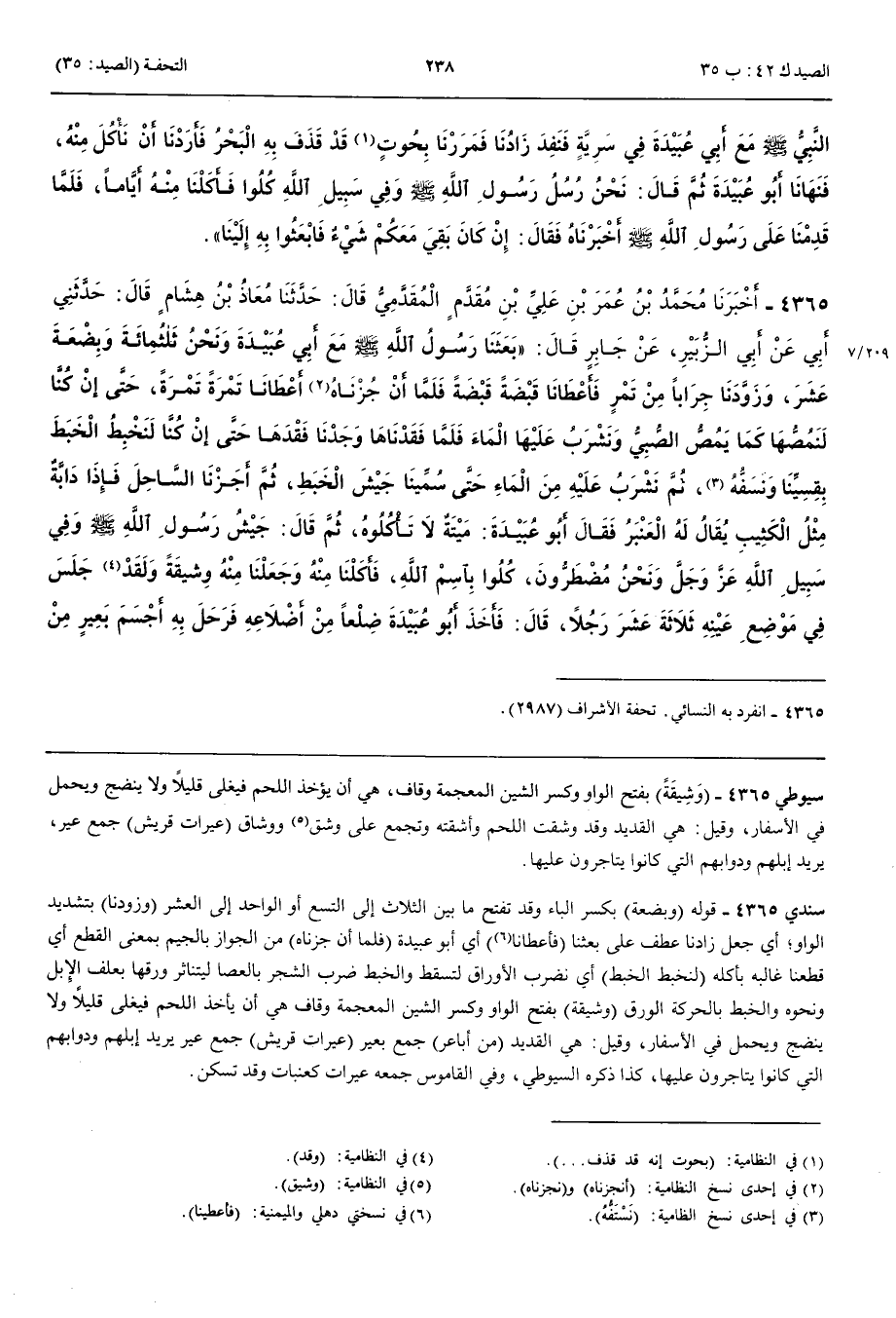 4365 - أَخْبَرَنَا مُحَمَّدُ بْنُ عُمَرَ بْنِ عَلِيِّ بْنِ مُقَدَّمٍ الْمُقَدَّمِيُّ قَالَ حَدَّثَنَا مُعَاذُ بْنُ هِشَامٍ قَالَ حَدَّثَنِي أَبِي عَنْ أَبِي الزُّبَيْرِ عَنْ جَابِرٍ قَالَ بَعَثَنَا رَسُولُ اللَّهِ صَلَّى اللَّهُ عَلَيْهِ وَسَلَّمَ مَعَ أَبِي عُبَيْدَةَ وَنَحْنُ ثَلَاثُ مِائَةٍ وَبِضْعَةَ عَشَرَ وَزَوَّدَنَا جِرَابًا مِنْ تَمْرٍ فَأَعْطَانَا قَبْضَةً قَبْضَةً فَلَمَّا أَنْ جُزْنَاهُ أَعْطَانَا تَمْرَةً تَمْرَةً حَتَّى إِنْ كُنَّا لَنَمُصُّهَا كَمَا يَمُصُّ الصَّبِيُّ وَنَشْرَبُ عَلَيْهَا الْمَاءَ فَلَمَّا فَقَدْنَاهَا وَجَدْنَا فَقْدَهَا حَتَّى إِنْ كُنَّا لَنَخْبِطُ الْخَبَطَ بِقِسِيِّنَا وَنَسَفُّهُ ثُمَّ نَشْرَبُ عَلَيْهِ مِنْ الْمَاءِ حَتَّى سُمِّينَا جَيْشَ الْخَبَطِ ثُمَّ أَجَزْنَا السَّاحِلَ فَإِذَا دَابَّةٌ مِثْلُ الْكَثِيبِ يُقَالُ لَهُ الْعَنْبَرُ فَقَالَ أَبُو عُبَيْدَةَ مَيْتَةٌ لَا تَأْكُلُوهُ ثُمَّ قَالَ جَيْشُ رَسُولِ اللَّهِ صَلَّى اللَّهُ عَلَيْهِ وَسَلَّمَ وَفِي سَبِيلِ اللَّهِ عَزَّ وَجَلَّ وَنَحْنُ مُضْطَرُّونَ كُلُوا بِاسْمِ اللَّهِ فَأَكَلْنَا مِنْهُ وَجَعَلْنَا مِنْهُ وَشِيقَةً وَلَقَدْ جَلَسَ فِي مَوْضِعِ عَيْنِهِ ثَلَاثَةَ عَشَرَ رَجُلًا قَالَ فَأَخَذَ أَبُو عُبَيْدَةَ ضِلْعًا مِنْ أَضْلَاعِهِ فَرَحَلَ بِهِ أَجْسَمَ بَعِيرٍ مِنْ أَبَاعِرِ الْقَوْمِ فَأَجَازَ تَحْتَهُ فَلَمَّا قَدِمْنَا عَلَى رَسُولِ اللَّهِ صَلَّى اللَّهُ عَلَيْهِ وَسَلَّمَ قَالَ مَا حَبَسَكُمْ قُلْنَا كُنَّا نَتَّبِعُ عِيرَاتِ قُرَيْشٍ وَذَكَرْنَا لَهُ مِنْ أَمْرِ الدَّابَّةِ فَقَالَ ذَاكَ رِزْقٌ رَزَقَكُمُوهُ اللَّهُ عَزَّ وَجَلَّ أَمَعَكُمْ مِنْهُ شَيْءٌ قَالَ قُلْنَا نَعَمْ