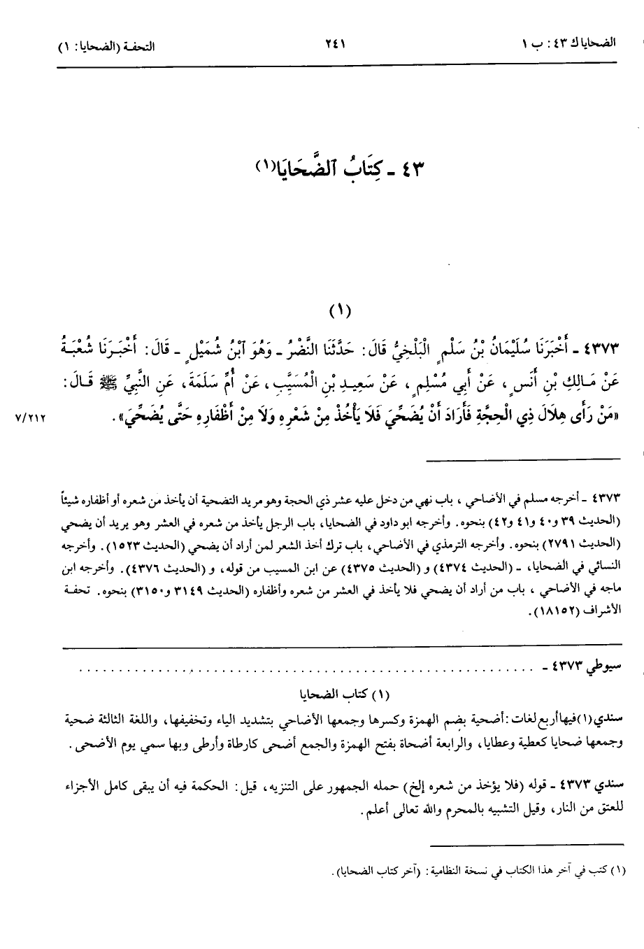 4373 - أَخْبَرَنَا سُلَيْمَانُ بْنُ سَلْمٍ الْبَلْخِيُّ قَالَ حَدَّثَنَا النَّضْرُ وَهُوَ ابْنُ شُمَيْلٍ قَالَ أَنْبَأَنَا شُعْبَةُ عَنْ مَالِكِ بْنِ أَنَسٍ عَنْ ابْنِ مُسْلِمٍ عَنْ سَعِيدِ بْنِ الْمُسَيَّبِ عَنْ أُمِّ سَلَمَةَ عَنْ النَّبِيِّ صَلَّى اللَّهُ عَلَيْهِ وَسَلَّمَ قَالَ مَنْ رَأَى هِلَالَ ذِي الْحِجَّةِ فَأَرَادَ أَنْ يُضَحِّيَ فَلَا يَأْخُذْ مِنْ شَعْرِهِ وَلَا مِنْ أَظْفَارِهِ حَتَّى يُضَحِّيَ