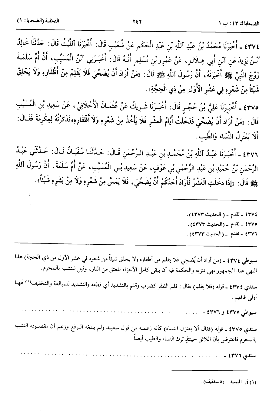 4375 - أَخْبَرَنَا عَلِيُّ بْنُ حُجْرٍ قَالَ أَنْبَأَنَا شَرِيكٌ عَنْ عُثْمَانَ الْأَحْلَافِيِّ عَنْ سَعِيدِ بْنِ الْمُسَيَّبِ قَالَ مَنْ أَرَادَ أَنْ يُضَحِّيَ فَدَخَلَتْ أَيَّامُ الْعَشْرِ فَلَا يَأْخُذْ مِنْ شَعْرِهِ وَلَا أَظْفَارِهِ فَذَكَرْتُهُ لِعِكْرِمَةَ فَقَالَ أَلَا يَعْتَزِلُ النِّسَاءَ وَالطِّيبَ
