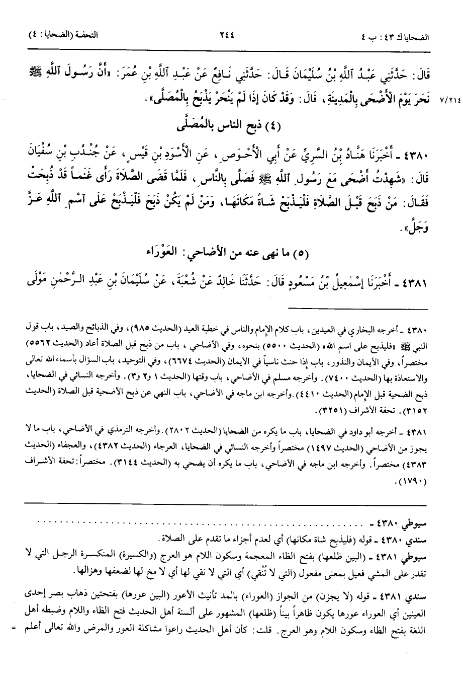 مَا نُهِيَ عَنْهُ مِنْ الْأَضَاحِيِّ الْعَوْرَاءِ 4381 - أَخْبَرَنَا إِسْمَعِيلُ بْنُ مَسْعُودٍ قَالَ حَدَّثَنَا خَالِدٌ عَنْ شُعْبَةَ عَنْ سُلَيْمَانَ بْنِ عَبْدِ الرَّحْمَنِ مَوْلَى بَنِي أَسَدٍ عَنْ أَبِي الضَّحَّاكِ عُبَيْدِ بْنِ فَيْرُوزَ مَوْلَى بَنِي شَيْبَانَ قَالَ قُلْتُ لِلْبَرَاءِ حَدِّثْنِي عَمَّا نَهَى عَنْهُ رَسُولُ اللَّهِ صَلَّى اللَّهُ عَلَيْهِ وَسَلَّمَ مِنْ الْأَضَاحِيِّ قَالَ قَامَ رَسُولُ اللَّهِ صَلَّى اللَّهُ عَلَيْهِ وَسَلَّمَ وَيَدِي أَقْصَرُ مِنْ يَدِهِ فَقَالَ أَرْبَعٌ لَا يَجُزْنَ الْعَوْرَاءُ الْبَيِّنُ عَوَرُهَا وَالْمَرِيضَةُ الْبَيِّنُ مَرَضُهَا وَالْعَرْجَاءُ الْبَيِّنُ ظَلْعُهَا وَالْكَسِيرَةُ الَّتِي لَا تُنْقِي قُلْتُ إِنِّي أَكْرَهُ أَنْ يَكُونَ فِي الْقَرْنِ نَقْصٌ وَأَنْ يَكُونَ فِي السِّنِّ نَقْصٌ قَالَ مَا كَرِهْتَهُ فَدَعْهُ وَلَا تُحَرِّمْهُ عَلَى أَحَدٍ