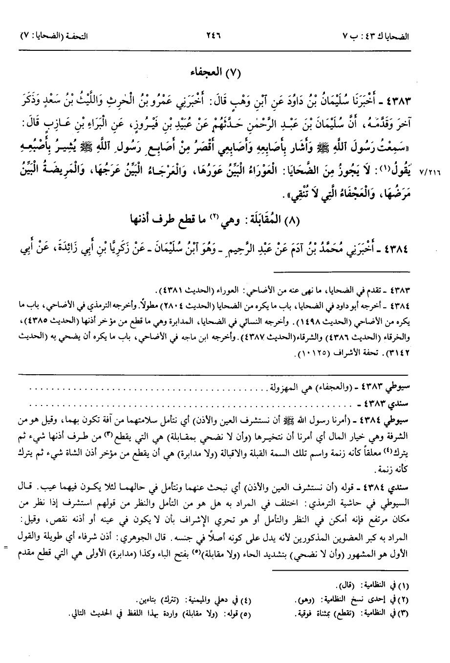 الْمُقَابَلَةُ وَهِيَ مَا قُطِعَ طَرَفُ أُذُنِهَا 4384 - أَخْبَرَنِي مُحَمَّدُ بْنُ آدَمَ عَنْ عَبْدِ الرَّحِيمِ وَهُوَ ابْنُ سُلَيْمَانَ عَنْ زَكَرِيَّا بْنِ أَبِي زَائِدَةَ عَنْ أَبِي إِسْحَقَ عَنْ شُرَيْحِ بْنِ النُّعْمَانِ عَنْ عَلِيٍّ رَضِيَ اللَّهُ عَنْهُ قَالَ أَمَرَنَا رَسُولُ اللَّهِ صَلَّى اللَّهُ عَلَيْهِ وَسَلَّمَ أَنْ نَسْتَشْرِفَ الْعَيْنَ وَالْأُذُنَ وَأَنْ لَا نُضَحِّيَ بِمُقَابَلَةٍ وَلَا مُدَابَرَةٍ وَلَا بَتْرَاءَ وَلَا خَرْقَاءَ