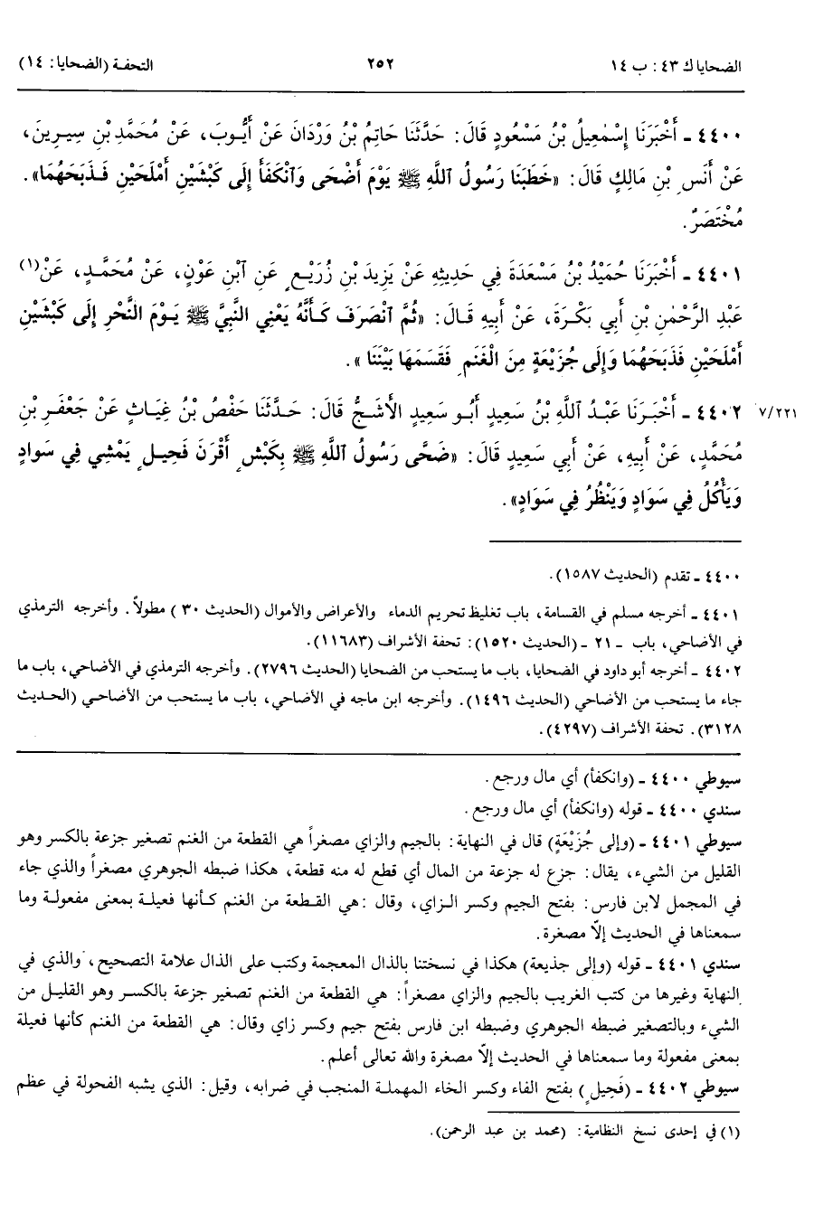 4400 - أَخْبَرَنَا إِسْمَعِيلُ بْنُ مَسْعُودٍ قَالَ حَدَّثَنَا حَاتِمُ بْنُ وَرْدَانَ عَنْ أَيُّوبَ عَنْ مُحَمَّدِ بْنِ سِيرِينَ عَنْ أَنَسِ بْنِ مَالِكٍ قَالَ خَطَبَنَا رَسُولُ اللَّهِ صَلَّى اللَّهُ عَلَيْهِ وَسَلَّمَ يَوْمَ أَضْحًى وَانْكَفَأَ إِلَى كَبْشَيْنِ أَمْلَحَيْنِ فَذَبَحَهُمَا مُخْتَصَرٌ