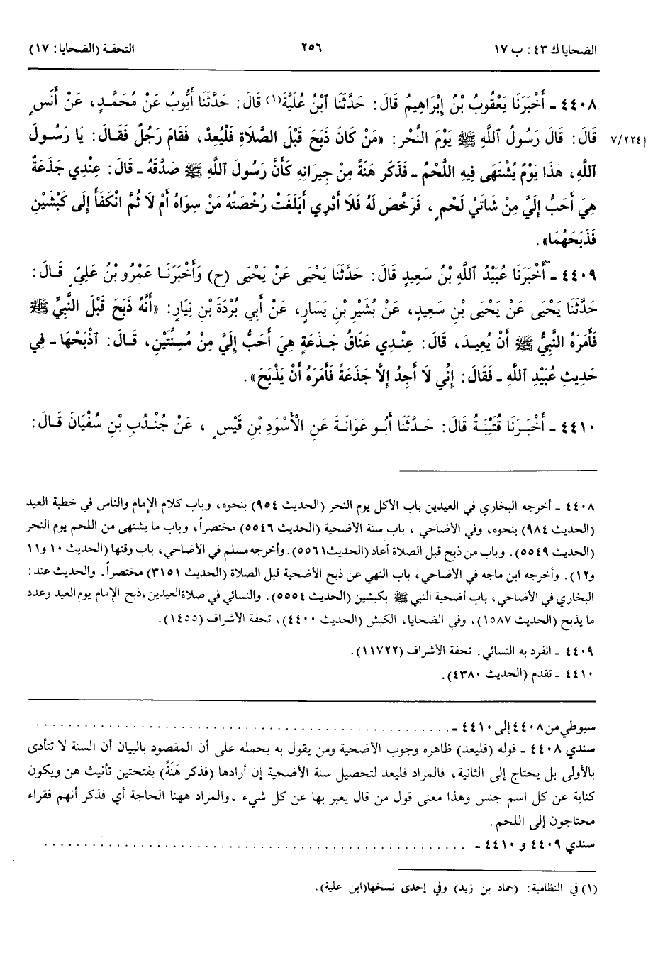 4408 - أَخْبَرَنَا يَعْقُوبُ بْنُ إِبْرَاهِيمَ قَالَ حَدَّثَنَا ابْنُ عُلَيَّةَ قَالَ حَدَّثَنَا أَيُّوبُ عَنْ مُحَمَّدٍ عَنْ أَنَسٍ قَالَ قَالَ رَسُولُ اللَّهِ صَلَّى اللَّهُ عَلَيْهِ وَسَلَّمَ يَوْمَ النَّحْرِ مَنْ كَانَ ذَبَحَ قَبْلَ الصَّلَاةِ فَلْيُعِدْ فَقَامَ رَجُلٌ فَقَالَ يَا رَسُولَ اللَّهِ هَذَا يَوْمٌ يُشْتَهَى فِيهِ اللَّحْمُ فَذَكَرَ هَنَةً مِنْ جِيرَانِهِ كَأَنَّ رَسُولَ اللَّهِ صَلَّى اللَّهُ عَلَيْهِ وَسَلَّمَ صَدَّقَهُ قَالَ عِنْدِي جَذَعَةٌ هِيَ أَحَبُّ إِلَيَّ مِنْ شَاتَيْ لَحْمٍ فَرَخَّصَ لَهُ فَلَا أَدْرِي أَبَلَغَتْ رُخْصَتُهُ مَنْ سِوَاهُ أَمْ لَا ثُمَّ انْكَفَأَ إِلَى كَبْشَيْنِ فَذَبَحَهُمَا