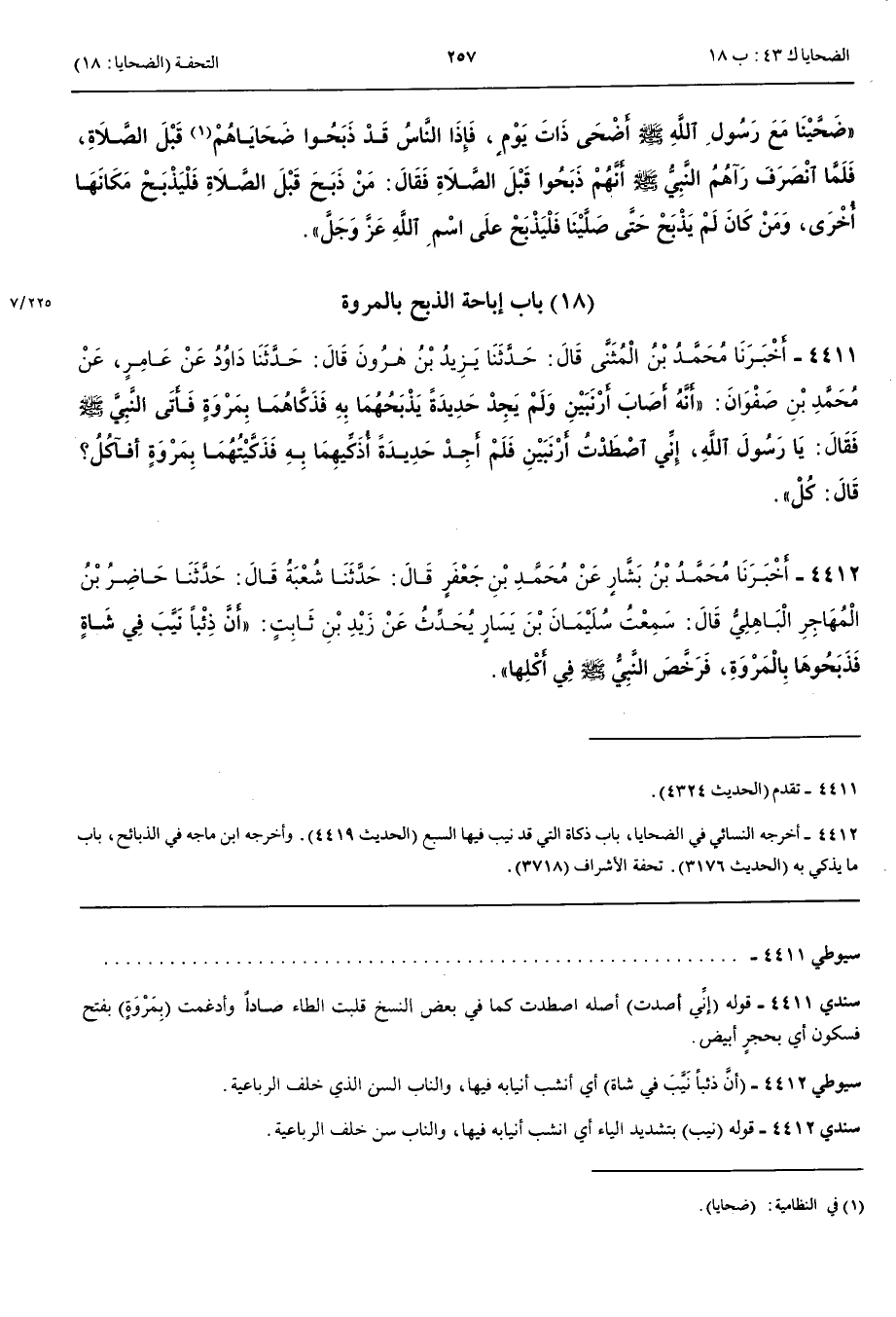 4412 - أَخْبَرَنَا مُحَمَّدُ بْنُ بَشَّارٍ عَنْ مُحَمَّدِ بْنِ جَعْفَرٍ قَالَ حَدَّثَنَا شُعْبَةُ قَالَ حَدَّثَنَا حَاضِرُ بْنُ الْمُهَاجِرِ الْبَاهِلِيُّ قَالَ سَمِعْتُ سُلَيْمَانَ بْنَ يَسَارٍ يُحَدِّثُ عَنْ زَيْدِ بْنِ ثَابِتٍ أَنَّ ذِئْبًا نَيَّبَ فِي شَاةٍ فَذَبَحُوهَا بِالْمَرْوَةِ فَرَخَّصَ النَّبِيُّ صَلَّى اللَّهُ عَلَيْهِ وَسَلَّمَ فِي أَكْلِهَا