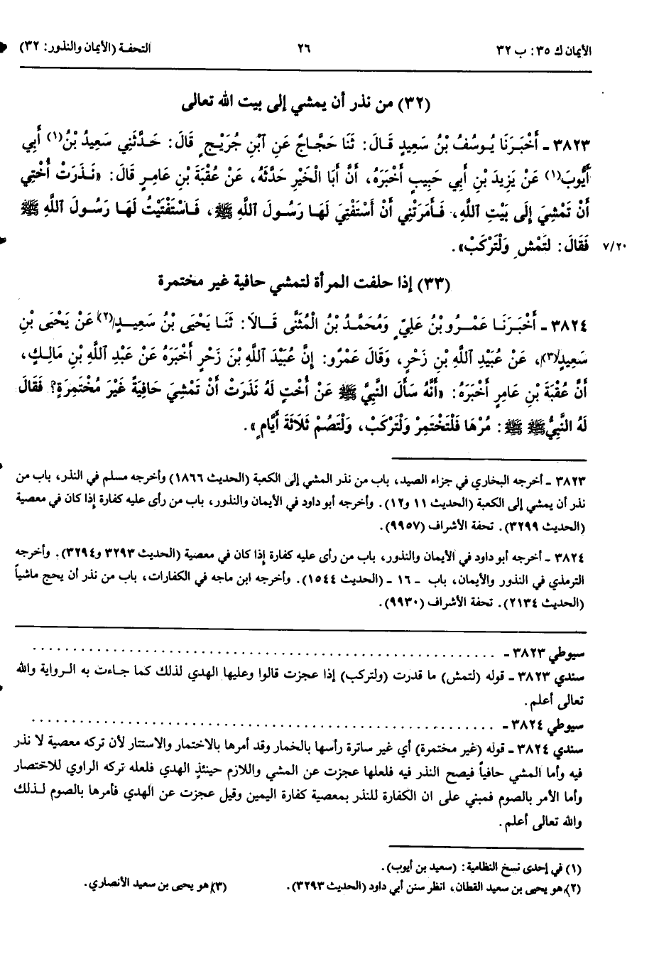 مَنْ نَذَرَ أَنْ يَمْشِيَ إِلَى بَيْتِ اللَّهِ تَعَالَى 3823 - أَخْبَرَنِي يُوسُفُ بْنُ سَعِيدٍ قَالَ حَدَّثَنَا حَجَّاجٌ عَنْ ابْنِ جُرَيْجٍ قَالَ حَدَّثَنِي سَعِيدُ بْنُ أَبِي أَيُّوبَ عَنْ يَزِيدَ بْنِ أَبِي حَبِيبٍ أَخْبَرَهُ أَنَّ أَبَا الْخَيْرِ حَدَّثَهُ عَنْ عُقْبَةَ بْنِ عَامِرٍ قَالَ نَذَرَتْ أُخْتِي أَنْ تَمْشِيَ إِلَى بَيْتِ اللَّهِ فَأَمَرَتْنِي أَنْ أَسْتَفْتِيَ لَهَا رَسُولَ اللَّهِ صَلَّى اللَّهُ عَلَيْهِ وَسَلَّمَ فَاسْتَفْتَيْتُ لَهَا النَّبِيَّ صَلَّى اللَّهُ عَلَيْهِ وَسَلَّمَ فَقَالَ لِتَمْشِ وَلْتَرْكَبْ