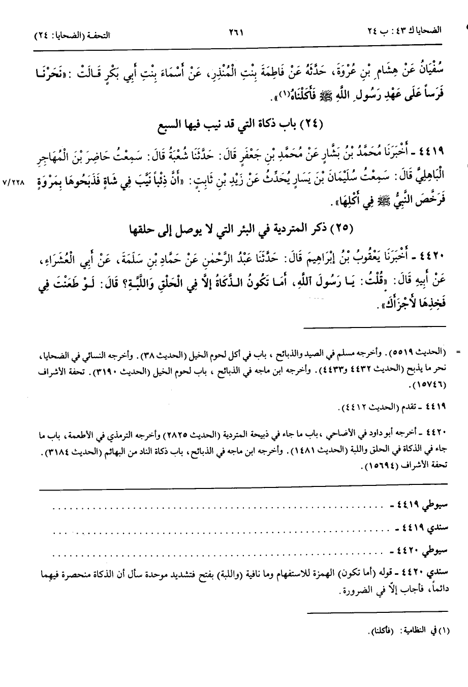 بَاب ذَكَاةِ الَّتِي قَدْ نَيَّبَ فِيهَا السَّبْعُ 4419 - أَخْبَرَنَا مُحَمَّدُ بْنُ بَشَّارٍ عَنْ مُحَمَّدِ بْنِ جَعْفَرٍ قَالَ حَدَّثَنَا شُعْبَةُ قَالَ سَمِعْتُ حَاضِرَ بْنَ الْمُهَاجِرِ الْبَاهِلِيَّ قَالَ سَمِعْتُ سُلَيْمَانَ بْنَ يَسَارٍ يُحَدِّثُ عَنْ زَيْدِ بْنِ ثَابِتٍ أَنَّ ذِئْبًا نَيَّبَ فِي شَاةٍ فَذَبَحُوهَا بِمَرْوَةٍ فَرَخَّصَ النَّبِيُّ صَلَّى اللَّهُ عَلَيْهِ وَسَلَّمَ فِي أَكْلِهَا