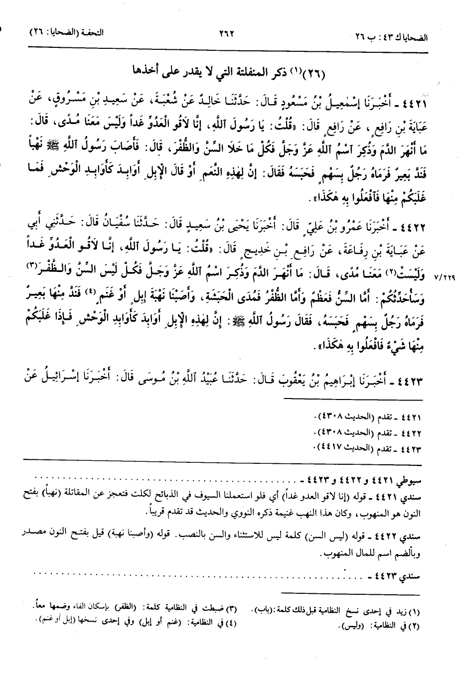4422 - أَخْبَرَنَا عَمْرُو بْنُ عَلِيٍّ قَالَ أَنْبَأَنَا يَحْيَى بْنُ سَعِيدٍ قَالَ حَدَّثَنَا سُفْيَانُ قَالَ حَدَّثَنِي أَبِي عَنْ عَبَايَةَ بْنِ رِفَاعَةَ عَنْ رَافِعِ بْنِ خَدِيجٍ قَالَ قُلْتُ يَا رَسُولَ اللَّهِ إِنَّا لَاقُو الْعَدُوِّ غَدًا وَلَيْسَتْ مَعَنَا مُدًى قَالَ مَا أَنْهَرَ الدَّمَ وَذُكِرَ اسْمُ اللَّهِ عَزَّ وَجَلَّ فَكُلْ لَيْسَ السِّنَّ وَالظُّفُرَ وَسَأُحَدِّثُكُمْ أَمَّا السِّنُّ فَعَظْمٌ وَأَمَّا الظُّفُرُ فَمُدَى الْحَبَشَةِ وَأَصَبْنَا نَهْبَةَ إِبِلٍ أَوْ غَنَمٍ فَنَدَّ مِنْهَا بَعِيرٌ فَرَمَاهُ رَجُلٌ بِسَهْمٍ فَحَبَسَهُ فَقَالَ رَسُولُ اللَّهِ صَلَّى اللَّهُ عَلَيْهِ وَسَلَّمَ إِنَّ لِهَذِهِ الْإِبِلِ أَوَابِدَ كَأَوَابِدِ الْوَحْشِ فَإِذَا غَلَبَكُمْ مِنْهَا شَيْءٌ فَافْعَلُوا بِهِ هَكَذَا