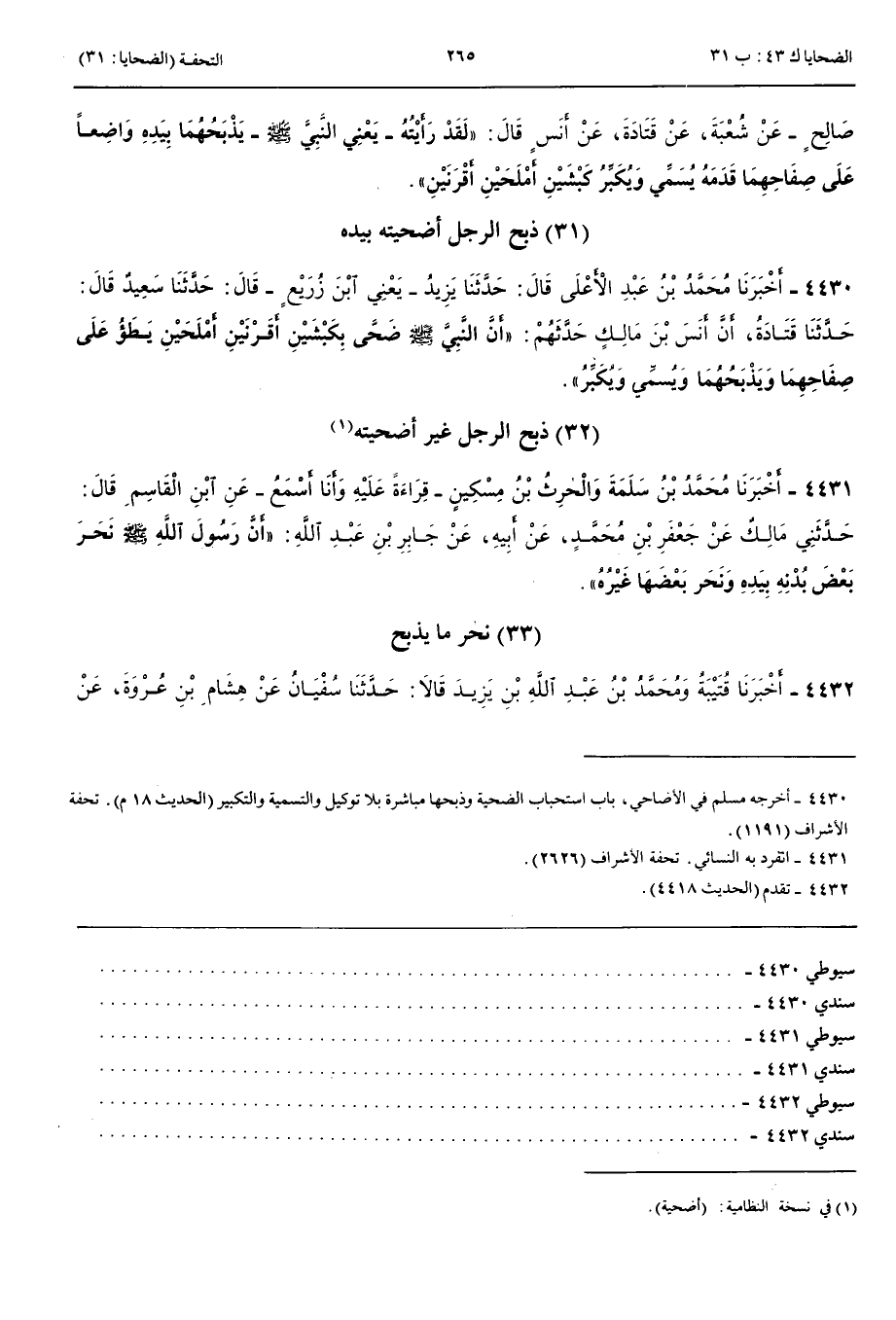 ذَبْحُ الرَّجُلِ أُضْحِيَّتَهُ بِيَدِهِ 4430 - أَخْبَرَنَا مُحَمَّدُ بْنُ عَبْدِ الْأَعْلَى قَالَ حَدَّثَنَا يَزِيدُ يَعْنِي ابْنَ زُرَيْعٍ قَالَ حَدَّثَنَا سَعِيدٌ قَالَ حَدَّثَنَا قَتَادَةُ أَنَّ أَنَسَ بْنَ مَالِكٍ حَدَّثَهُمْ أَنَّ نَبِيَّ اللَّهِ صَلَّى اللَّهُ عَلَيْهِ وَسَلَّمَ ضَحَّى بِكَبْشَيْنِ أَقْرَنَيْنِ أَمْلَحَيْنِ يَطَؤُ عَلَى صِفَاحِهِمَا وَيَذْبَحُهُمَا وَيُسَمِّي وَيُكَبِّرُ