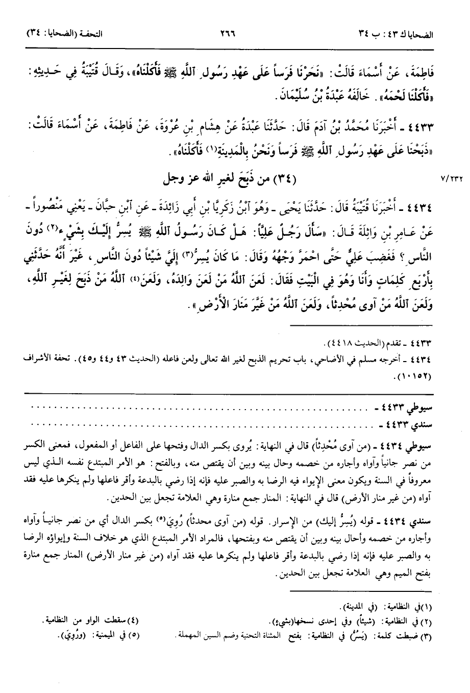 مَنْ ذَبَحَ لِغَيْرِ اللَّهِ عَزَّ وَجَلَّ 4434 - أَخْبَرَنَا قُتَيْبَةُ قَالَ حَدَّثَنَا يَحْيَى وَهُوَ ابْنُ زَكَرِيَّا بْنِ أَبِي زَائِدَةَ عَنْ ابْنِ حَيَّانَ يَعْنِي مَنْصُورًا عَنْ عَامِرِ بْنِ وَاثِلَةَ قَالَ سَأَلَ رَجُلٌ عَلِيًّا هَلْ كَانَ رَسُولُ اللَّهِ صَلَّى اللَّهُ عَلَيْهِ وَسَلَّمَ يُسِرُّ إِلَيْكَ بِشَيْءٍ دُونَ النَّاسِ فَغَضِبَ عَلِيٌّ حَتَّى احْمَرَّ وَجْهُهُ وَقَالَ مَا كَانَ يُسِرُّ إِلَيَّ شَيْئًا دُونَ النَّاسِ غَيْرَ أَنَّهُ حَدَّثَنِي بِأَرْبَعِ كَلِمَاتٍ وَأَنَا وَهُوَ فِي الْبَيْتِ فَقَالَ لَعَنَ اللَّهُ مَنْ لَعَنَ وَالِدَهُ وَلَعَنَ اللَّهُ مَنْ ذَبَحَ لِغَيْرِ اللَّهِ وَلَعَنَ اللَّهُ مَنْ آوَى مُحْدِثًا وَلَعَنَ اللَّهُ مَنْ غَيَّرَ مَنَارَ الْأَرْضِ