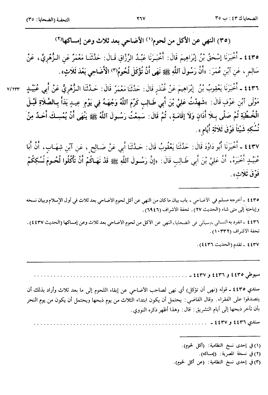 4436 - أَخْبَرَنَا يَعْقُوبُ بْنُ إِبْرَاهِيمَ عَنْ غُنْدَرٍ قَالَ حَدَّثَنَا مَعْمَرٌ قَالَ حَدَّثَنَا الزُّهْرِيُّ عَنْ أَبِي عُبَيْدٍ مَوْلَى ابْنِ عَوْفٍ قَالَ شَهِدْتُ عَلِيَّ بْنَ أَبِي طَالِبٍ كَرَّمَ اللَّهُ وَجْهَهُ فِي يَوْمِ عِيدٍ بَدَأَ بِالصَّلَاةِ قَبْلَ الْخُطْبَةِ ثُمَّ صَلَّى بِلَا أَذَانٍ وَلَا إِقَامَةٍ ثُمَّ قَالَ سَمِعْتُ رَسُولَ اللَّهِ صَلَّى اللَّهُ عَلَيْهِ وَسَلَّمَ يَنْهَى أَنْ يُمْسِكَ أَحَدٌ مِنْ نُسُكِهِ شَيْئًا فَوْقَ ثَلَاثَةِ أَيَّامٍ