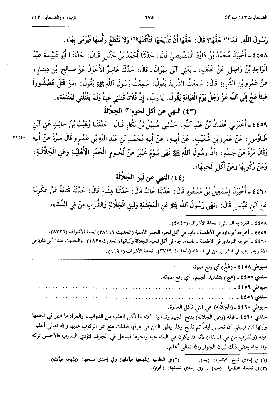 4458 - أَخْبَرَنَا مُحَمَّدُ بْنُ دَاوُدَ الْمِصِّيصِيُّ قَالَ حَدَّثَنَا أَحْمَدُ بْنُ حَنْبَلٍ قَالَ حَدَّثَنَا أَبُو عُبَيْدَةَ عَبْدُ الْوَاحِدِ بْنُ وَاصِلٍ عَنْ خَلَفٍ يَعْنِي ابْنَ مِهْرَانَ قَالَ حَدَّثَنَا عَامِرٌ الْأَحْوَلُ عَنْ صَالِحِ بْنِ دِينَارٍ عَنْ عَمْرِو بْنِ الشَّرِيدِ قَالَ سَمِعْتُ الشَّرِيدَ يَقُولُ سَمِعْتُ رَسُولَ اللَّهِ صَلَّى اللَّهُ عَلَيْهِ وَسَلَّمَ يَقُولُ مَنْ قَتَلَ عُصْفُورًا عَبَثًا عَجَّ إِلَى اللَّهِ عَزَّ وَجَلَّ يَوْمَ الْقِيَامَةِ يَقُولُ يَا رَبِّ إِنَّ فُلَانًا قَتَلَنِي عَبَثًا وَلَمْ يَقْتُلْنِي لِمَنْفَعَةٍ