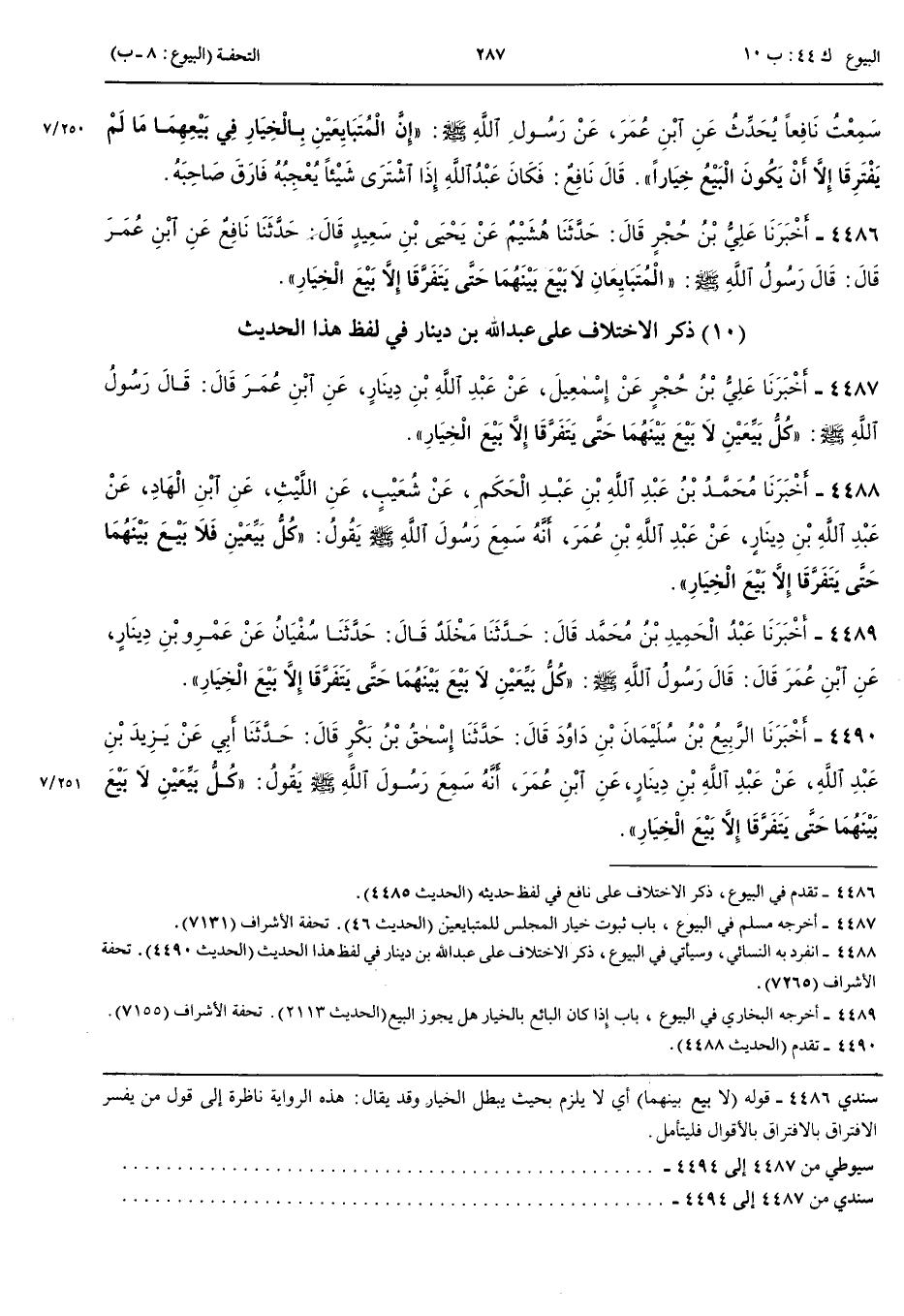 4486 - أَخْبَرَنَا عَلِيُّ بْنُ حُجْرٍ قَالَ حَدَّثَنَا هُشَيْمٌ عَنْ يَحْيَى بْنِ سَعِيدٍ قَالَ حَدَّثَنَا نَافِعٌ عَنْ ابْنِ عُمَرَ قَالَ قَالَ رَسُولُ اللَّهِ صَلَّى اللَّهُ عَلَيْهِ وَسَلَّمَ الْمُتَبَايِعَانِ لَا بَيْعَ بَيْنَهُمَا حَتَّى يَتَفَرَّقَا إِلَّا بَيْعَ الْخِيَارِ