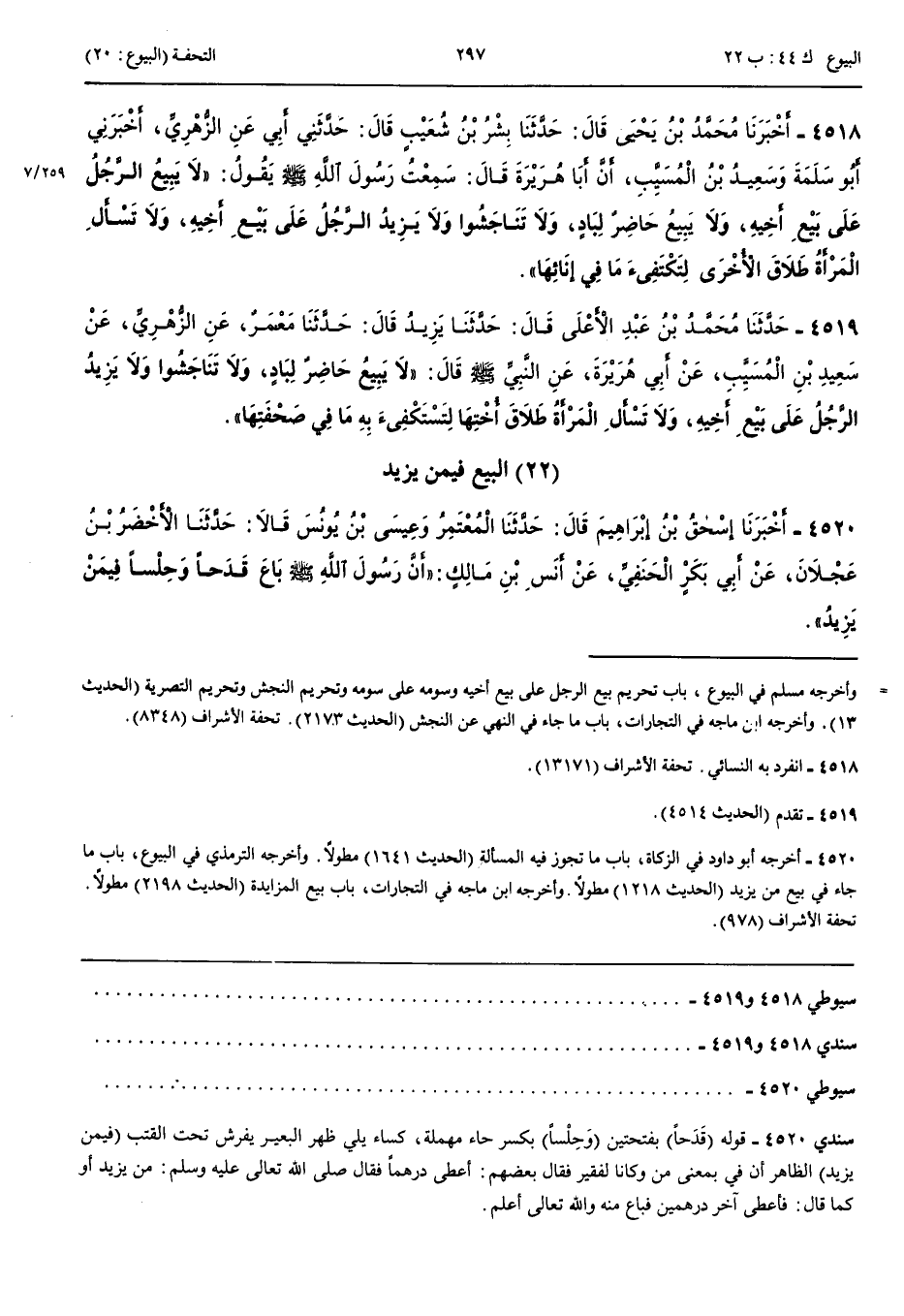 4519 - حَدَّثَنِي مُحَمَّدُ بْنُ عَبْدِ الْأَعْلَى قَالَ حَدَّثَنَا يَزِيدُ قَالَ حَدَّثَنَا مَعْمَرٌ عَنْ الزُّهْرِيِّ عَنْ سَعِيدِ بْنِ الْمُسَيَّبِ عَنْ أَبِي هُرَيْرَةَ عَنْ النَّبِيِّ صَلَّى اللَّهُ عَلَيْهِ وَسَلَّمَ قَالَ لَا يَبِيعُ حَاضِرٌ لِبَادٍ وَلَا تَنَاجَشُوا وَلَا يَزِيدُ الرَّجُلُ عَلَى بَيْعِ أَخِيهِ وَلَا تَسْأَلْ الْمَرْأَةُ طَلَاقَ أُخْتِهَا لِتَسْتَكْفِئَ بِهِ مَا فِي صَحْفَتِهَا