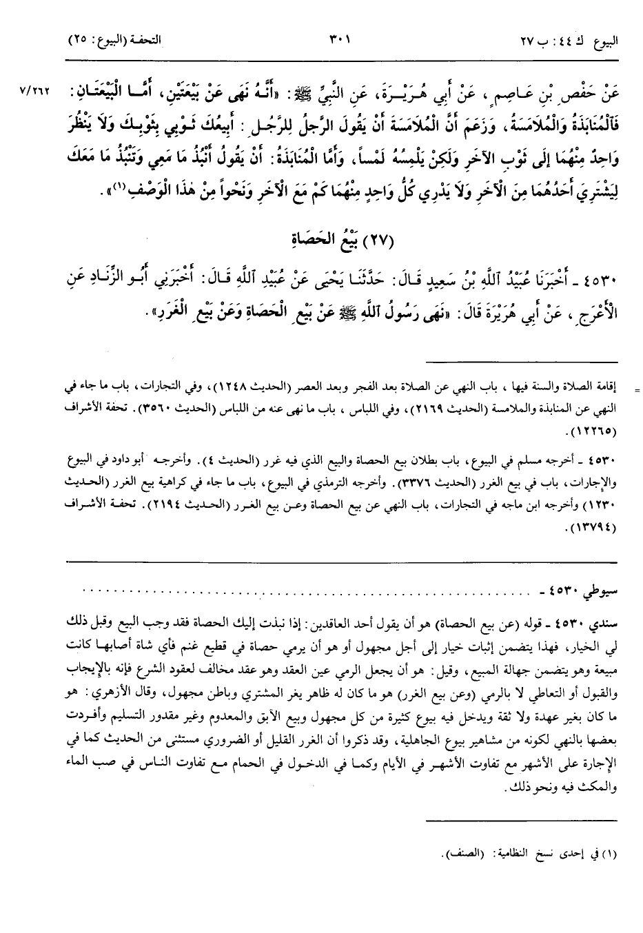 بَيْعُ الْحَصَاةِ 4530 - أَخْبَرَنَا عُبَيْدُ اللَّهِ بْنُ سَعِيدٍ قَالَ حَدَّثَنَا يَحْيَى عَنْ عُبَيْدِ اللَّهِ قَالَ أَخْبَرَنِي أَبُو الزِّنَادِ عَنْ الْأَعْرَجِ عَنْ أَبِي هُرَيْرَةَ قَالَ نَهَى رَسُولُ اللَّهِ صَلَّى اللَّهُ عَلَيْهِ وَسَلَّمَ عَنْ بَيْعِ الْحَصَاةِ وَعَنْ بَيْعِ الْغَرَرِ