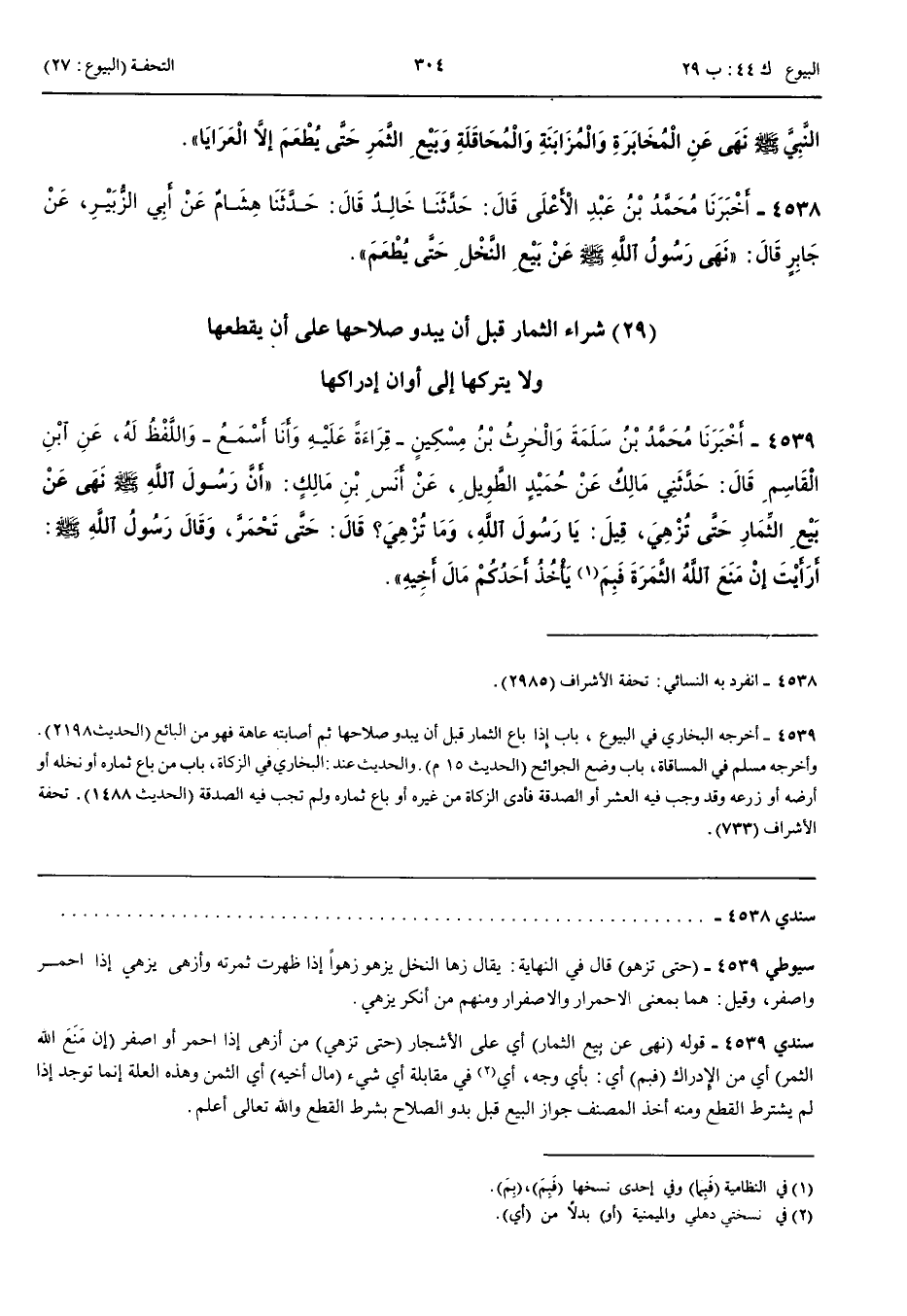 4538 - أَخْبَرَنَا مُحَمَّدُ بْنُ عَبْدِ الْأَعْلَى قَالَ حَدَّثَنَا خَالِدٌ قَالَ حَدَّثَنَا هِشَامٌ عَنْ أَبِي الزُّبَيْرِ عَنْ جَابِرٍ قَالَ نَهَى رَسُولُ اللَّهِ صَلَّى اللَّهُ عَلَيْهِ وَسَلَّمَ عَنْ بَيْعِ النَّخْلِ حَتَّى يُطْعَمَ