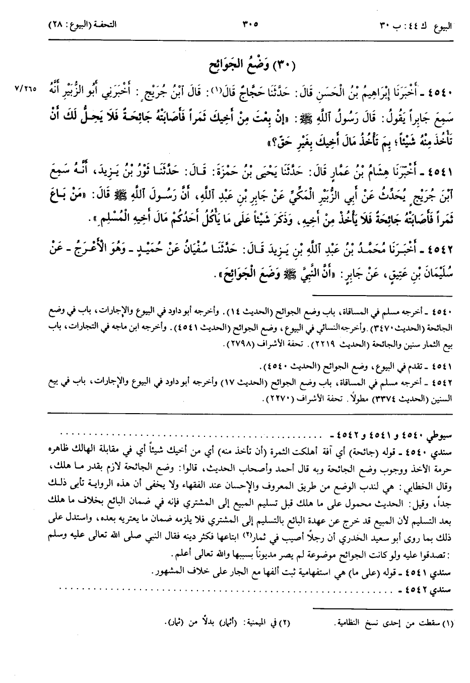 وَضْعُ الْجَوَائِحِ 4540 - أَخْبَرَنَا إِبْرَاهِيمُ بْنُ الْحَسَنِ قَالَ حَدَّثَنَا حَجَّاجٌ قَالَ قَالَ ابْنُ جُرَيْجٍ أَخْبَرَنِي أَبُو الزُّبَيْرِ أَنَّهُ سَمِعَ جَابِرًا يَقُولُ قَالَ رَسُولُ اللَّهِ صَلَّى اللَّهُ عَلَيْهِ وَسَلَّمَ إِنْ بِعْتَ مِنْ أَخِيكَ ثَمَرًا فَأَصَابَتْهُ جَائِحَةٌ فَلَا يَحِلُّ لَكَ أَنْ تَأْخُذَ مِنْهُ شَيْئًا بِمَ تَأْخُذُ مَالَ أَخِيكَ بِغَيْرِ حَقٍّ