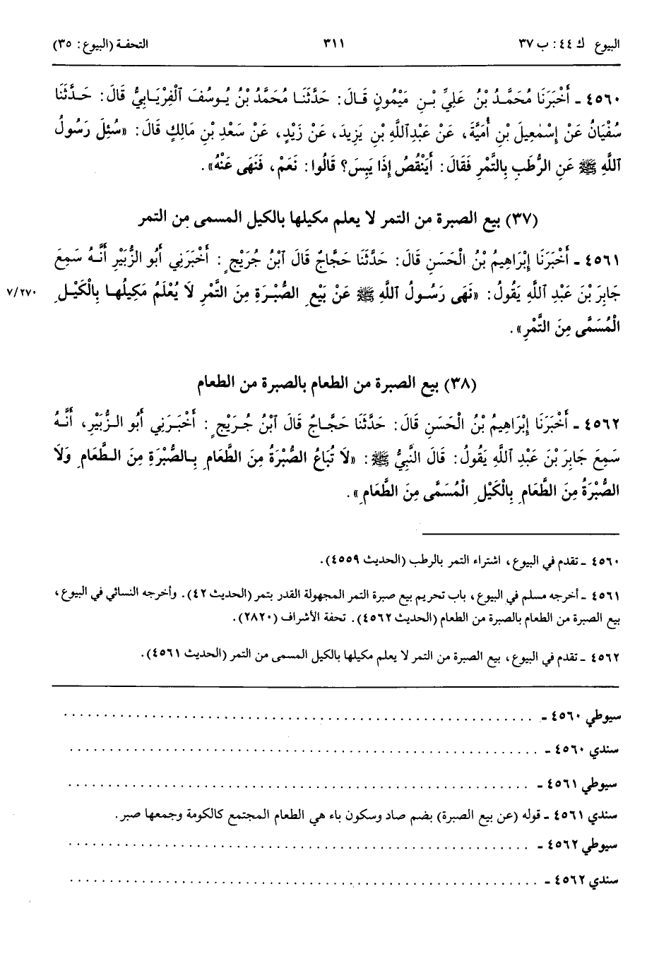 بَيْعُ الصُّبْرَةِ مِنْ الطَّعَامِ بِالصُّبْرَةِ مِنْ الطَّعَامِ 4562 - أَخْبَرَنَا إِبْرَاهِيمُ بْنُ الْحَسَنِ قَالَ حَدَّثَنَا حَجَّاجٌ قَالَ ابْنُ جُرَيْجٍ أَخْبَرَنِي أَبُو الزُّبَيْرِ أَنَّهُ سَمِعَ جَابِرَ بْنَ عَبْدِ اللَّهِ يَقُولُ قَالَ النَّبِيُّ صَلَّى اللَّهُ عَلَيْهِ وَسَلَّمَ لَا تُبَاعُ الصُّبْرَةُ مِنْ الطَّعَامِ بِالصُّبْرَةِ مِنْ الطَّعَامِ وَلَا الصُّبْرَةُ مِنْ الطَّعَامِ بِالْكَيْلِ الْمُسَمَّى مِنْ الطَّعَامِ