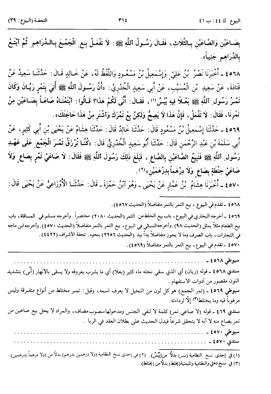 4570 - أَخْبَرَنَا هِشَامُ بْنُ عَمَّارٍ عَنْ يَحْيَى وَهُوَ ابْنُ حَمْزَةَ قَالَ حَدَّثَنَا الْأَوْزَاعِيُّ عَنْ يَحْيَى قَالَ حَدَّثَنِي أَبُو سَلَمَةَ قَالَ حَدَّثَنِي أَبُو سَعِيدٍ قَالَ كُنَّا نَبِيعُ تَمْرَ الْجَمْعِ صَاعَيْنِ بِصَاعٍ فَقَالَ النَّبِيُّ صَلَّى اللَّهُ عَلَيْهِ وَسَلَّمَ لَا صَاعَيْ تَمْرٍ بِصَاعٍ وَلَا صَاعَيْ حِنْطَةٍ بِصَاعٍ وَلَا دِرْهَمَيْنِ بِدِرْهَمٍ