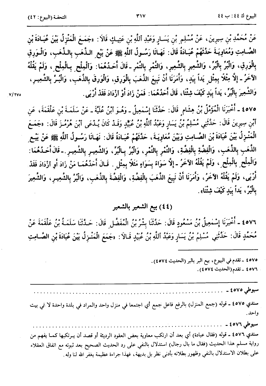 بَيْعُ الشَّعِيرِ بِالشَّعِيرِ 4576 - أَخْبَرَنَا إِسْمَعِيلُ بْنُ مَسْعُودٍ قَالَ حَدَّثَنَا بِشْرُ بْنُ الْمُفَضَّلِ قَالَ حَدَّثَنَا سَلَمَةُ بْنُ عَلْقَمَةَ عَنْ مُحَمَّدٍ قَالَ حَدَّثَنِي مُسْلِمُ بْنُ يَسَارٍ وَعَبْدُ اللَّهِ بْنُ عُبَيْدٍ قَالَا جَمَعَ الْمَنْزِلُ بَيْنَ عُبَادَةَ بْنِ الصَّامِتِ وَبَيْنَ مُعَاوِيَةَ فَقَالَ عُبَادَةُ نَهَى رَسُولُ اللَّهِ صَلَّى اللَّهُ عَلَيْهِ وَسَلَّمَ أَنْ نَبِيعَ الذَّهَبَ بِالذَّهَبِ وَالْوَرِقَ بِالْوَرِقِ وَالْبُرَّ بِالْبُرِّ وَالشَّعِيرَ بِالشَّعِيرِ وَالتَّمْرَ بِالتَّمْرِ قَالَ أَحَدُهُمَا وَالْمِلْحَ بِالْمِلْحِ وَلَمْ يَقُلْ الْآخَرُ إِلَّا سَوَاءً بِسَوَاءٍ مِثْلًا بِمِثْلٍ قَالَ أَحَدُهُمَا مَنْ زَادَ أَوْ ازْدَادَ فَقَدْ أَرْبَى وَلَمْ يَقُلْ الْآخَرُ وَأَمَرَنَا أَنْ نَبِيعَ الذَّهَبَ بِالْوَرِقِ وَالْوَرِقَ بِالذَّهَبِ وَالْبُرَّ بِالشَّعِيرِ وَالشَّعِيرَ بِالْبُرِّ يَدًا بِيَدٍ كَيْفَ شِئْنَا فَبَلَغَ هَذَا الْحَدِيثُ مُعَاوِيَةَ فَقَامَ فَقَالَ مَا بَالُ رِجَالٍ يُحَدِّثُونَ أَحَادِيثَ عَنْ رَسُولِ اللَّهِ صَلَّى اللَّهُ عَلَيْهِ وَسَلَّمَ قَدْ صَحِبْنَاهُ وَلَمْ نَسْمَعْهُ مِنْهُ فَبَلَغَ ذَلِكَ عُبَادَةَ بْنَ الصَّامِتِ فَقَامَ فَأَعَادَ الْحَدِيثَ فَقَالَ لَنُحَدِّثَنَّ بِمَا سَمِعْنَاهُ مِنْ رَسُولِ اللَّهِ صَلَّى اللَّهُ عَلَيْهِ وَسَلَّمَ وَإِنْ رَغِمَ مُعَاوِيَةُ خَالَفَهُ قَتَادَةُ رَوَاهُ عَنْ مُسْلِمِ بْنِ يَسَارٍ عَنْ أَبِي الْأَشْعَثِ عَنْ عُبَادَةَ