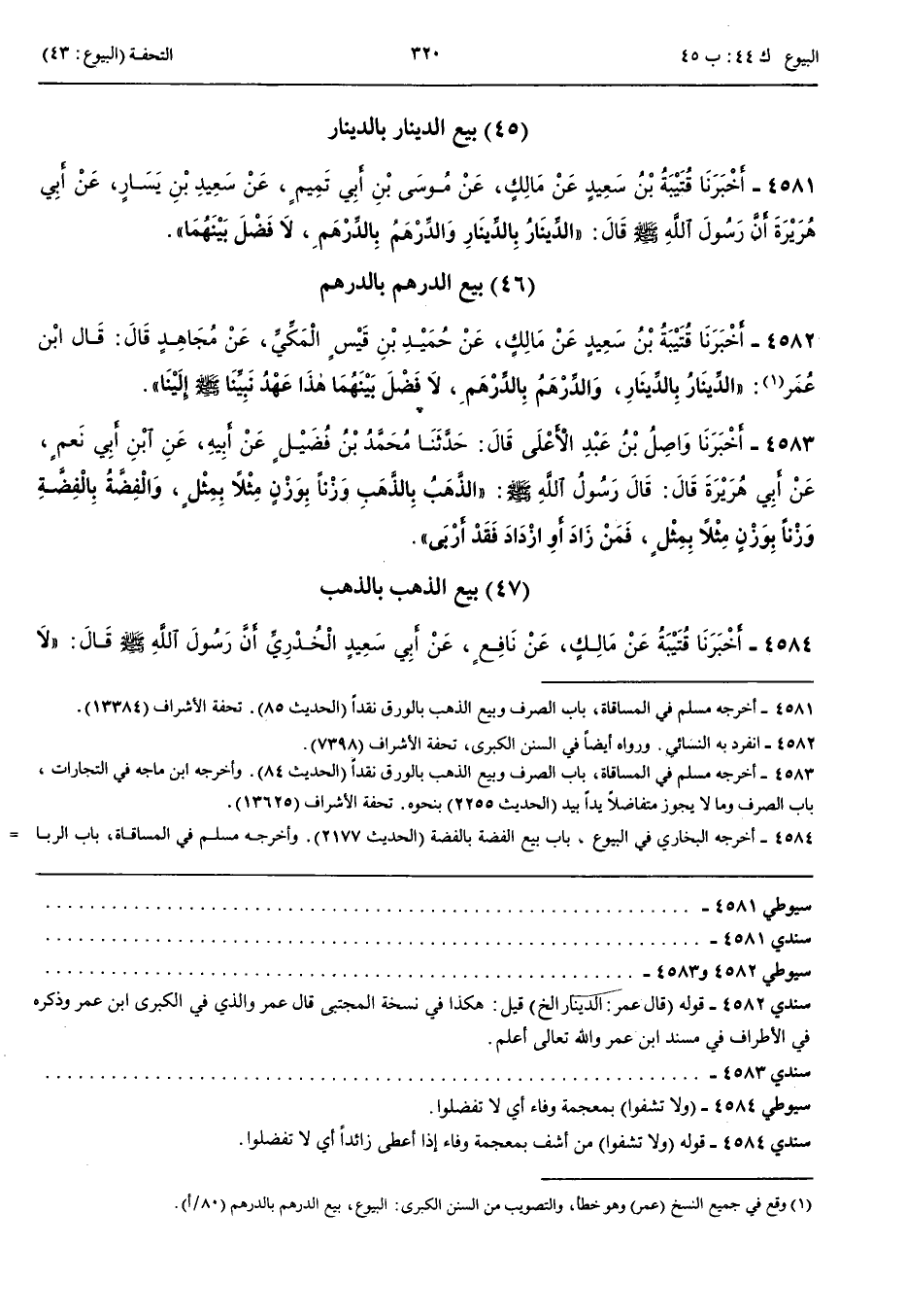 بَيْعُ الدِّينَارِ بِالدِّينَارِ 4581 - أَخْبَرَنَا قُتَيْبَةُ بْنُ سَعِيدٍ عَنْ مَالِكٍ عَنْ مُوسَى بْنِ أَبِي تَمِيمٍ عَنْ سَعِيدِ بْنِ يَسَارٍ عَنْ أَبِي هُرَيْرَةَ أَنَّ رَسُولَ اللَّهِ صَلَّى اللَّهُ عَلَيْهِ وَسَلَّمَ قَالَ الدِّينَارُ بِالدِّينَارِ وَالدِّرْهَمُ بِالدِّرْهَمِ لَا فَضْلَ بَيْنَهُمَا