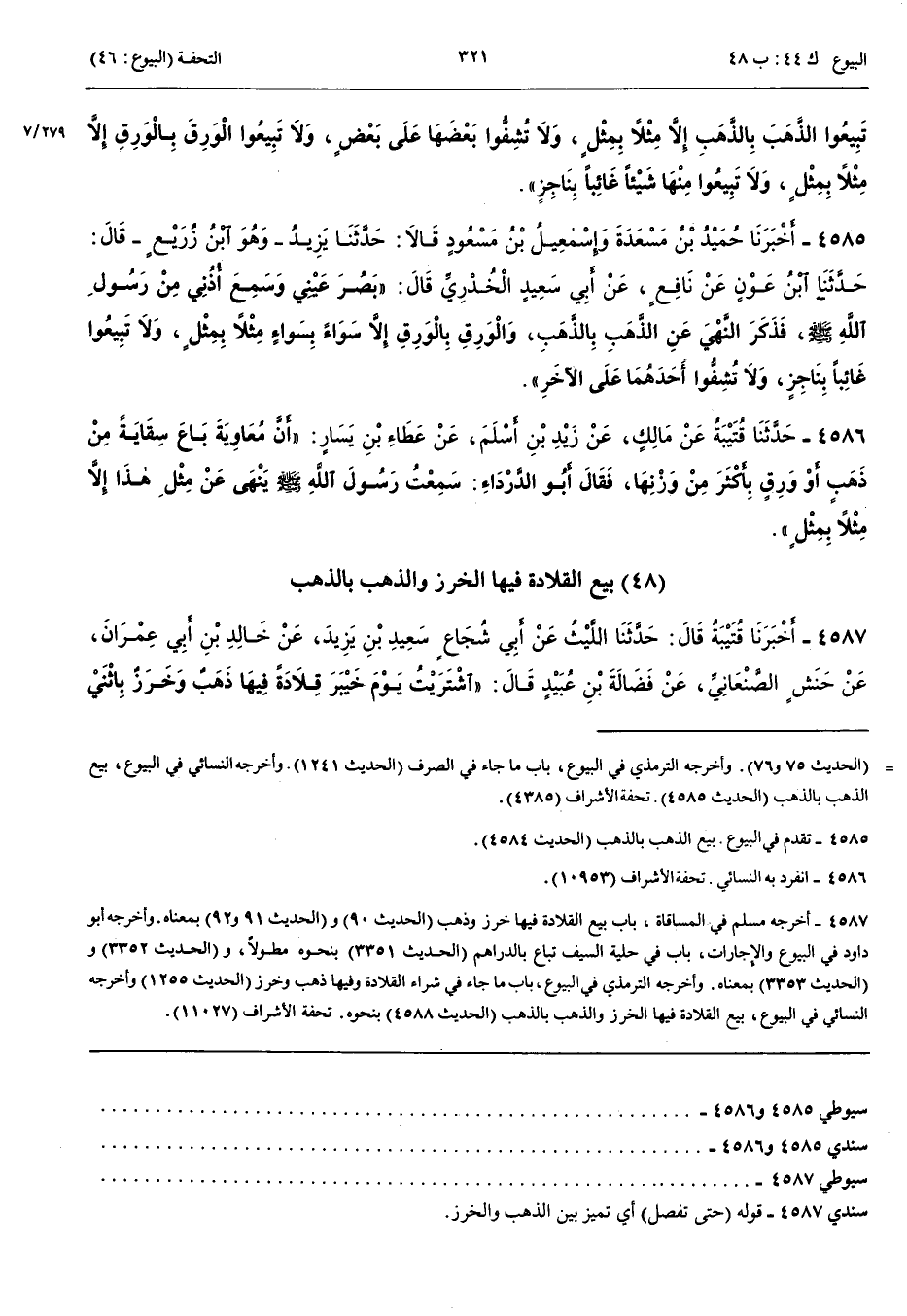 بَيْعُ الْقِلَادَةِ فِيهَا الْخَرَزُ وَالذَّهَبُ بِالذَّهَبِ 4587 - أَخْبَرَنَا قُتَيْبَةُ قَالَ حَدَّثَنَا اللَّيْثُ عَنْ أَبِي شُجَاعٍ سَعِيدِ بْنِ يَزِيدَ عَنْ خَالِدِ بْنِ أَبِي عِمْرَانَ عَنْ حَنَشٍ الصَّنْعَانِيِّ عَنْ فَضَالَةَ بْنِ عُبَيْدٍ قَالَ اشْتَرَيْتُ يَوْمَ خَيْبَرَ قِلَادَةً فِيهَا ذَهَبٌ وَخَرَزٌ بِاثْنَيْ عَشَرَ دِينَارًا فَفَصَّلْتُهَا فَوَجَدْتُ فِيهَا أَكْثَرَ مِنْ اثْنَيْ عَشَرَ دِينَارًا فَذُكِرَ ذَلِكَ لِلنَّبِيِّ صَلَّى اللَّهُ عَلَيْهِ وَسَلَّمَ فَقَالَ لَا تُبَاعُ حَتَّى تُفَصَّلَ