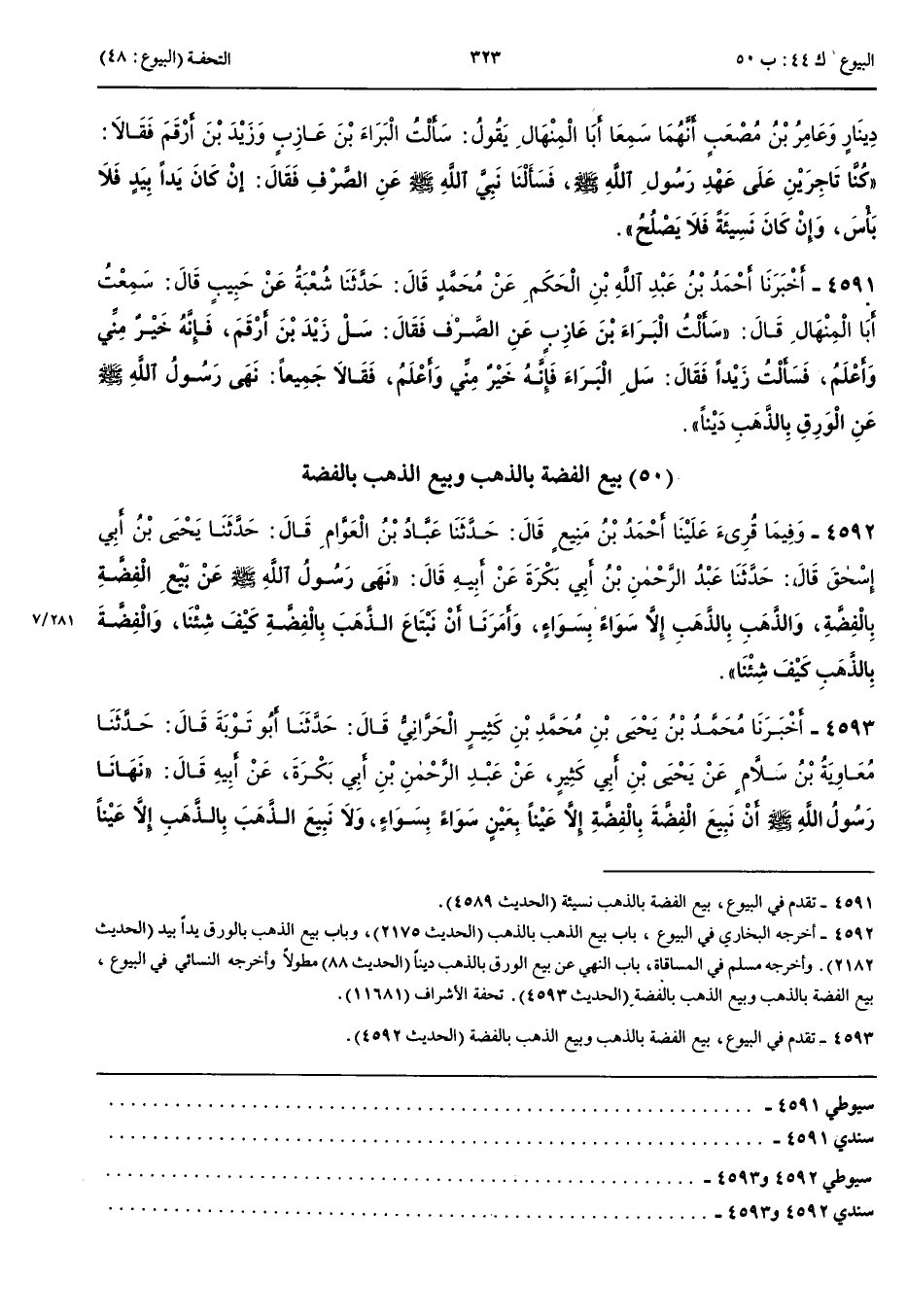 بَيْعُ الْفِضَّةِ بِالذَّهَبِ وَبَيْعُ الذَّهَبِ بِالْفِضَّةِ 4592 - وَفِيمَا قُرِئَ عَلَيْنَا أَحْمَدُ بْنُ مَنِيعٍ قَالَ حَدَّثَنَا عَبَّادُ بْنُ الْعَوَّامِ قَالَ حَدَّثَنَا يَحْيَى بْنُ أَبِي إِسْحَقَ قَالَ حَدَّثَنَا عَبْدُ الرَّحْمَنِ بْنُ أَبِي بَكْرَةَ عَنْ أَبِيهِ قَالَ نَهَى رَسُولُ اللَّهِ صَلَّى اللَّهُ عَلَيْهِ وَسَلَّمَ عَنْ بَيْعِ الْفِضَّةِ بِالْفِضَّةِ وَالذَّهَبِ بِالذَّهَبِ إِلَّا سَوَاءً بِسَوَاءٍ وَأَمَرَنَا أَنْ نَبْتَاعَ الذَّهَبَ بِالْفِضَّةِ كَيْفَ شِئْنَا وَالْفِضَّةَ بِالذَّهَبِ كَيْفَ شِئْنَا