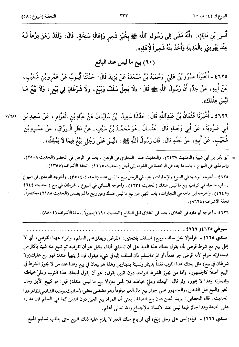 بَيْعُ مَا لَيْسَ عِنْدَ الْبَائِعِ 4625 - أَخْبَرَنَا عَمْرُو بْنُ عَلِيٍّ وَحُمَيْدُ بْنُ مَسْعَدَةَ عَنْ يَزِيدَ قَالَ حَدَّثَنَا أَيُّوبُ عَنْ عَمْرِو بْنِ شُعَيْبٍ عَنْ أَبِيهِ عَنْ جَدِّهِ أَنَّ رَسُولَ اللَّهِ صَلَّى اللَّهُ عَلَيْهِ وَسَلَّمَ قَالَ لَا يَحِلُّ سَلَفٌ وَبَيْعٌ وَلَا شَرْطَانِ فِي بَيْعٍ وَلَا بَيْعُ مَا لَيْسَ عِنْدَكَ