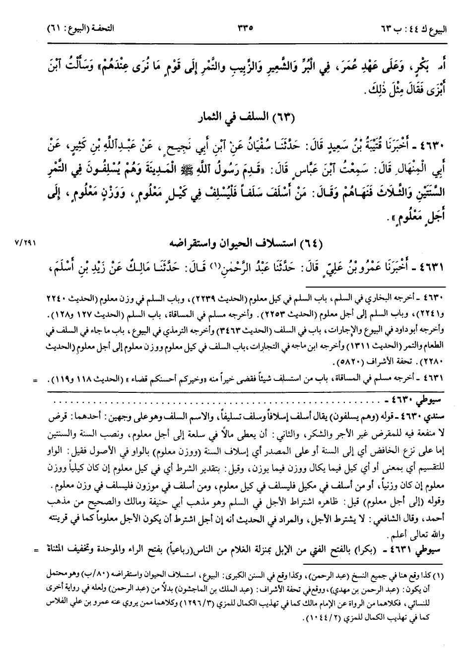 السَّلَفُ فِي الثِّمَارِ 4630 - أَخْبَرَنَا قُتَيْبَةُ بْنُ سَعِيدٍ قَالَ حَدَّثَنَا سُفْيَانُ عَنْ ابْنِ أَبِي نَجِيحٍ عَنْ عَبْدِ اللَّهِ بْنِ كَثِيرٍ عَنْ أَبِي الْمِنْهَالِ قَالَ سَمِعْتُ ابْنَ عَبَّاسٍ قَالَ قَدِمَ رَسُولُ اللَّهِ صَلَّى اللَّهُ عَلَيْهِ وَسَلَّمَ الْمَدِينَةَ وَهُمْ يُسْلِفُونَ فِي التَّمْرِ السَّنَتَيْنِ وَالثَّلَاثَ فَنَهَاهُمْ وَقَالَ مَنْ أَسْلَفَ سَلَفًا فَلْيُسْلِفْ فِي كَيْلٍ مَعْلُومٍ وَوَزْنٍ مَعْلُومٍ إِلَى أَجَلٍ مَعْلُومٍ