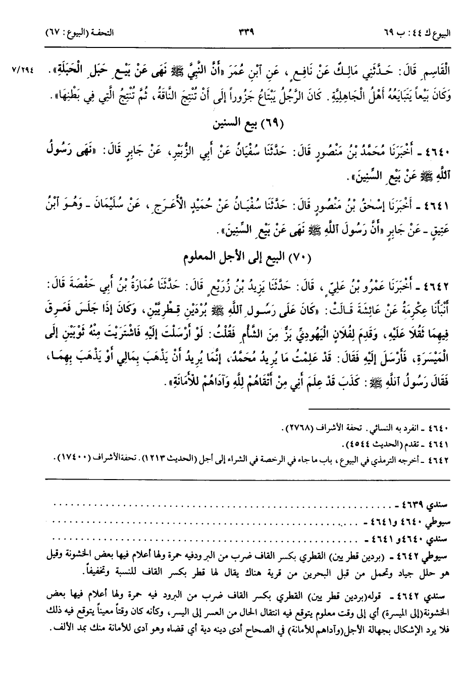 بَيْعُ السِّنِينَ 4640 - أَخْبَرَنَا مُحَمَّدُ بْنُ مَنْصُورٍ قَالَ حَدَّثَنَا سُفْيَانُ عَنْ أَبِي الزُّبَيْرِ عَنْ جَابِرٍ قَالَ نَهَى رَسُولُ اللَّهِ صَلَّى اللَّهُ عَلَيْهِ وَسَلَّمَ عَنْ بَيْعِ السِّنِينَ