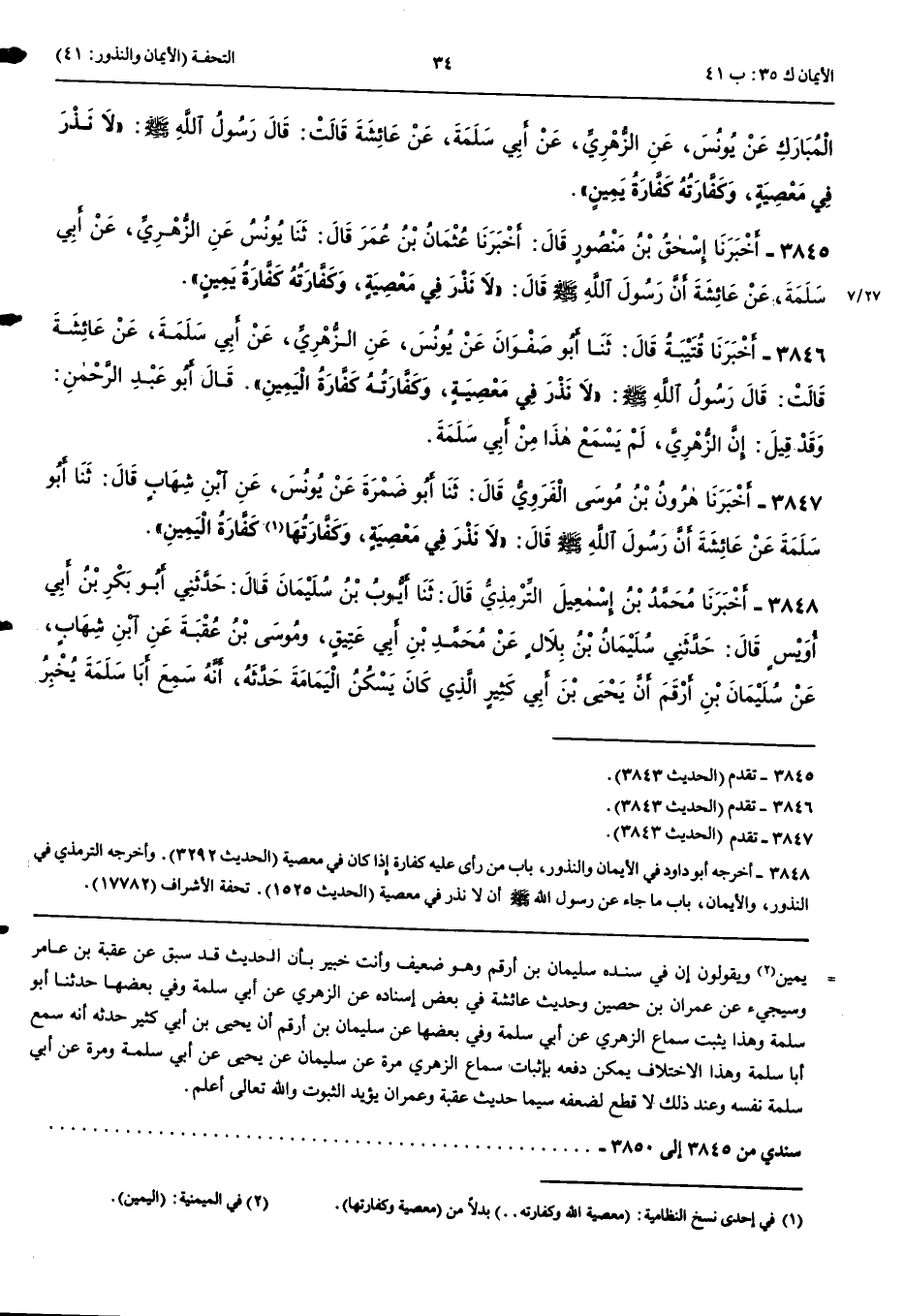 3845 - أَخْبَرَنَا إِسْحَقُ بْنُ مَنْصُورٍ قَالَ أَنْبَأَنَا عُثْمَانُ بْنُ عُمَرَ قَالَ حَدَّثَنَا يُونُسُ عَنْ الزُّهْرِيِّ عَنْ أَبِي سَلَمَةَ عَنْ عَائِشَةَ أَنَّ رَسُولَ اللَّهِ صَلَّى اللَّهُ عَلَيْهِ وَسَلَّمَ قَالَ لَا نَذْرَ فِي مَعْصِيَةٍ وَكَفَّارَتُهُ كَفَّارَةُ يَمِينٍ