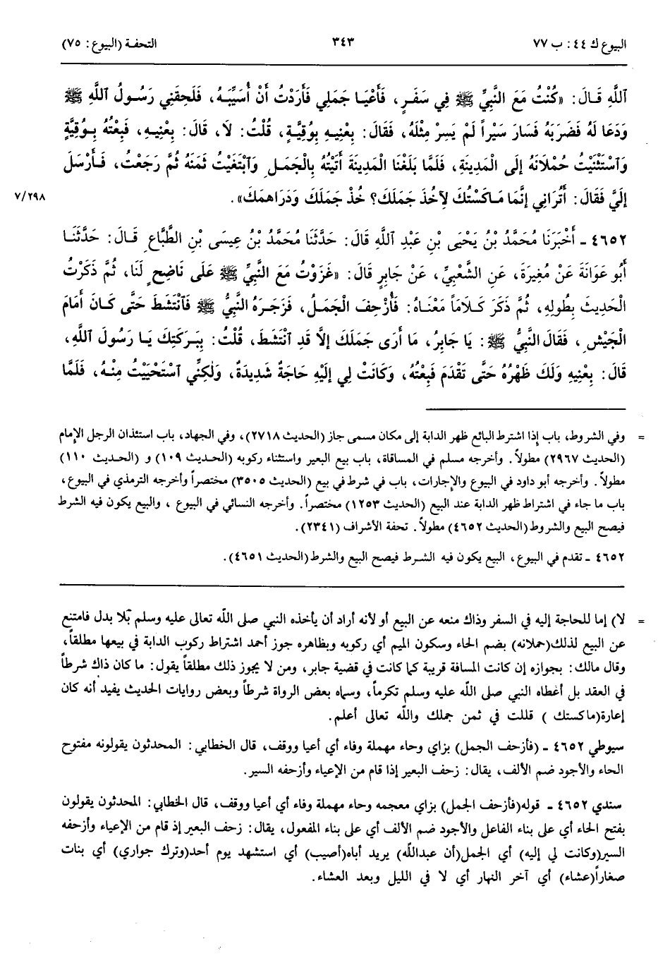 4652 - أَخْبَرَنَا مُحَمَّدُ بْنُ يَحْيَى بْنِ عَبْدِ اللَّهِ قَالَ حَدَّثَنَا مُحَمَّدُ بْنُ عِيسَى بْنِ الطَّبَّاعِ قَالَ حَدَّثَنَا أَبُو عَوَانَةَ عَنْ مُغِيرَةَ عَنْ الشَّعْبِيِّ عَنْ جَابِرٍ قَالَ غَزَوْتُ مَعَ النَّبِيِّ صَلَّى اللَّهُ عَلَيْهِ وَسَلَّمَ عَلَى نَاضِحٍ لَنَا ثُمَّ ذَكَرْتُ الْحَدِيثَ بِطُولِهِ ثُمَّ ذَكَرَ كَلَامًا مَعْنَاهُ فَأُزْحِفَ الْجَمَلُ فَزَجَرَهُ النَّبِيُّ صَلَّى اللَّهُ عَلَيْهِ وَسَلَّمَ فَانْتَشَطَ حَتَّى كَانَ أَمَامَ الْجَيْشِ فَقَالَ النَّبِيُّ صَلَّى اللَّهُ عَلَيْهِ وَسَلَّمَ يَا جَابِرُ مَا أَرَى جَمَلَكَ إِلَّا قَدْ انْتَشَطَ قُلْتُ بِبَرَكَتِكَ يَا رَسُولَ اللَّهِ قَالَ بِعْنِيهِ وَلَكَ ظَهْرُهُ حَتَّى تَقْدَمَ فَبِعْتُهُ وَكَانَتْ لِي إِلَيْهِ حَاجَةٌ شَدِيدَةٌ وَلَكِنِّي اسْتَحْيَيْتُ مِنْهُ فَلَمَّا قَضَيْنَا غَزَاتَنَا وَدَنَوْنَا اسْتَأْذَنْتُهُ بِالتَّعْجِيلِ فَقُلْتُ يَا رَسُولَ اللَّهِ إِنِّي حَدِيثُ عَهْدٍ بِعُرْسٍ قَالَ أَبِكْرًا تَزَوَّجْتَ أَمْ ثَيِّبًا قُلْتُ بَلْ ثَيِّبًا يَا رَسُولَ اللَّهِ إِنَّ عَبْدَ اللَّهِ بْنَ عَمْرٍو أُصِيبَ وَتَرَكَ جَوَارِيَ أَبْكَارًا فَكَرِهْتُ أَنْ آتِيَهُنَّ بِمِثْلِهِنَّ فَتَزَوَّجْتُ ثَيِّبًا تُعَلِّمُهُنَّ وَتُؤَدِّبُهُنَّ فَأَذِنَ لِي وَقَالَ لِي ائْتِ أَهْلَكَ عِشَاءً فَلَمَّا قَدِمْتُ أَخْبَرْتُ خَالِي بِبَيْعِي الْجَمَلَ فَلَامَنِي فَلَمَّا قَدِمَ رَسُولُ اللَّهِ صَلَّى اللَّهُ عَلَيْهِ وَسَلَّمَ غَدَوْتُ بِالْجَمَلِ فَأَعْطَانِي ثَمَنَ الْجَمَلِ وَالْجَمَلَ وَسَهْمًا مَعَ النَّاسِ