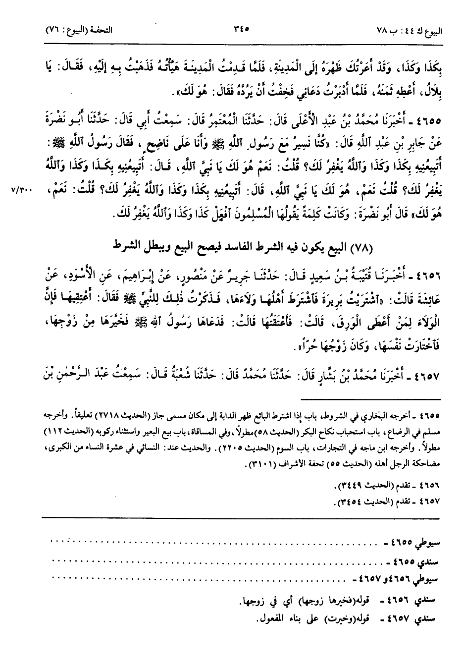 الْبَيْعُ يَكُونُ فِيهِ الشَّرْطُ الْفَاسِدُ فَيَصِحُّ الْبَيْعُ وَيَبْطُلُ الشَّرْطُ 4656 - أَخْبَرَنَا قُتَيْبَةُ بْنُ سَعِيدٍ قَالَ حَدَّثَنَا جَرِيرٌ عَنْ مَنْصُورٍ عَنْ إِبْرَاهِيمَ عَنْ الْأَسْوَدِ عَنْ عَائِشَةَ قَالَتْ اشْتَرَيْتُ بَرِيرَةَ فَاشْتَرَطَ أَهْلُهَا وَلَاءَهَا فَذَكَرْتُ ذَلِكَ لِلنَّبِيِّ صَلَّى اللَّهُ عَلَيْهِ وَسَلَّمَ فَقَالَ أَعْتِقِيهَا فَإِنَّ الْوَلَاءَ لِمَنْ أَعْطَى الْوَرِقَ قَالَتْ فَأَعْتَقْتُهَا قَالَتْ فَدَعَاهَا رَسُولُ اللَّهِ صَلَّى اللَّهُ عَلَيْهِ وَسَلَّمَ فَخَيَّرَهَا مِنْ زَوْجِهَا فَاخْتَارَتْ نَفْسَهَا وَكَانَ زَوْجُهَا حُرًّا