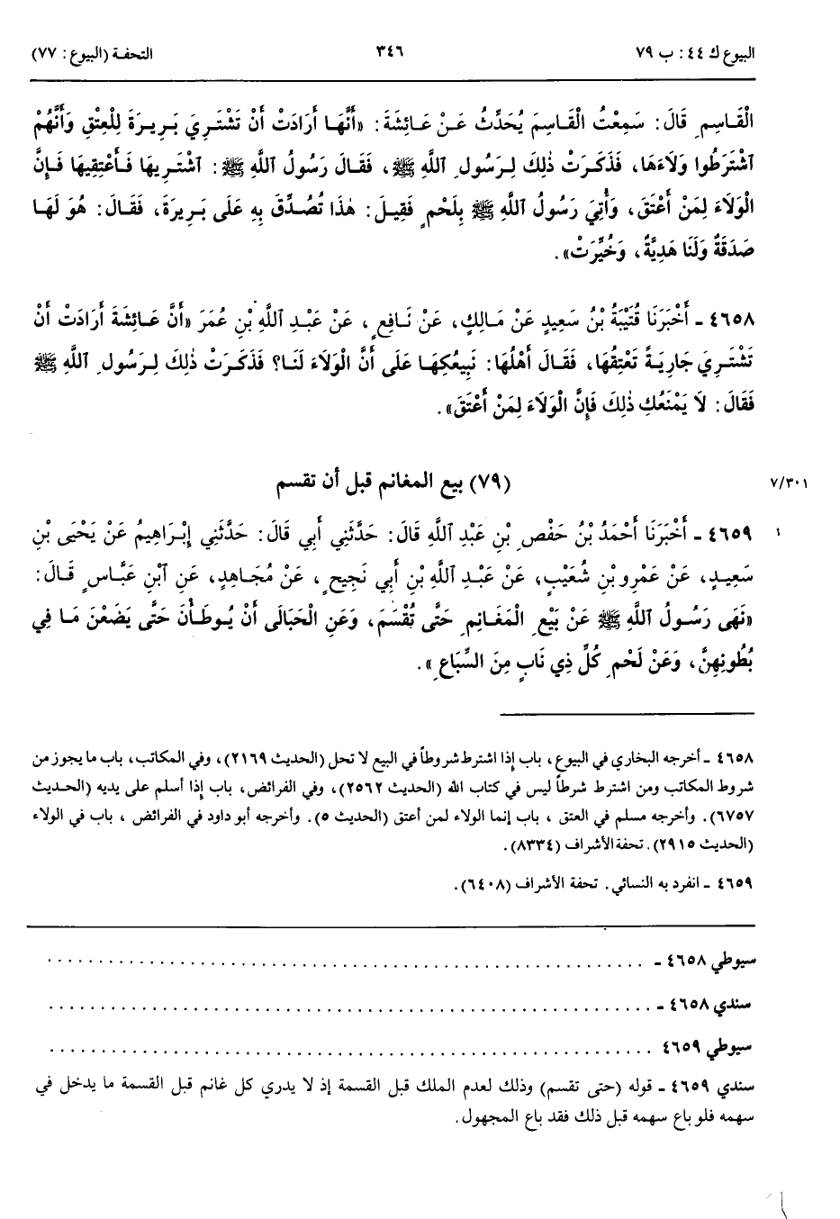 بَيْعُ الْمَغَانِمِ قَبْلَ أَنْ تُقْسَمَ 4659 - أَخْبَرَنَا أَحْمَدُ بْنُ حَفْصِ بْنِ عَبْدِ اللَّهِ قَالَ حَدَّثَنِي أَبِي قَالَ حَدَّثَنِي إِبْرَاهِيمُ عَنْ يَحْيَى بْنِ سَعِيدٍ عَنْ عَمْرِو بْنِ شُعَيْبٍ عَنْ عَبْدِ اللَّهِ بْنِ أَبِي نَجِيحٍ عَنْ مُجَاهِدٍ عَنْ ابْنِ عَبَّاسٍ قَالَ نَهَى رَسُولُ اللَّهِ صَلَّى اللَّهُ عَلَيْهِ وَسَلَّمَ عَنْ بَيْعِ الْمَغَانِمِ حَتَّى تُقْسَمَ وَعَنْ الْحَبَالَى أَنْ يُوطَأْنَ حَتَّى يَضَعْنَ مَا فِي بُطُونِهِنَّ وَعَنْ لَحْمِ كُلِّ ذِي نَابٍ مِنْ السِّبَاعِ