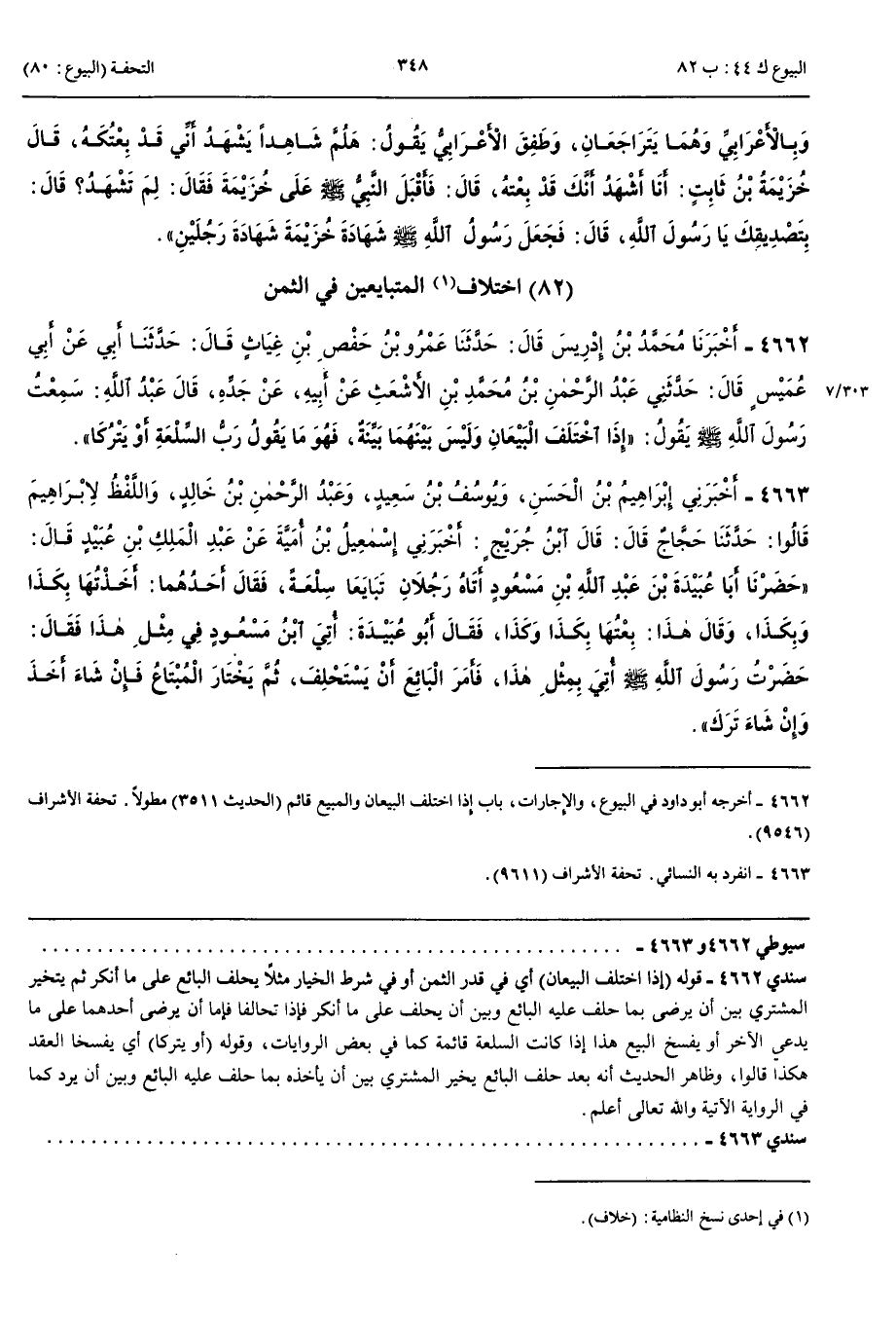 4663 - أَخْبَرَنِي إِبْرَاهِيمُ بْنُ الْحَسَنِ وَيُوسُفُ بْنُ سَعِيدٍ وَعَبْدُ الرَّحْمَنِ بْنُ خَالِدٍ وَاللَّفْظُ لِإِبْرَاهِيمَ قَالُوا حَدَّثَنَا حَجَّاجٌ قَالَ قَالَ ابْنُ جُرَيْجٍ أَخْبَرَنِي إِسْمَعِيلُ بْنُ أُمَيَّةَ عَنْ عَبْدِ الْمَلِكِ بْنِ عُبَيْدٍ قَالَ حَضَرْنَا أَبَا عُبَيْدَةَ بْنَ عَبْدِ اللَّهِ بْنِ مَسْعُودٍ أَتَاهُ رَجُلَانِ تَبَايَعَا سِلْعَةً فَقَالَ أَحَدُهُمَا أَخَذْتُهَا بِكَذَا وَبِكَذَا وَقَالَ هَذَا بِعْتُهَا بِكَذَا وَكَذَا فَقَالَ أَبُو عُبَيْدَةَ أُتِيَ ابْنُ مَسْعُودٍ فِي مِثْلِ هَذَا فَقَالَ حَضَرْتُ رَسُولَ اللَّهِ صَلَّى اللَّهُ عَلَيْهِ وَسَلَّمَ أُتِيَ بِمِثْلِ هَذَا فَأَمَرَ الْبَائِعَ أَنْ يَسْتَحْلِفَ ثُمَّ يَخْتَارَ الْمُبْتَاعُ فَإِنْ شَاءَ أَخَذَ وَإِنْ شَاءَ تَرَكَ