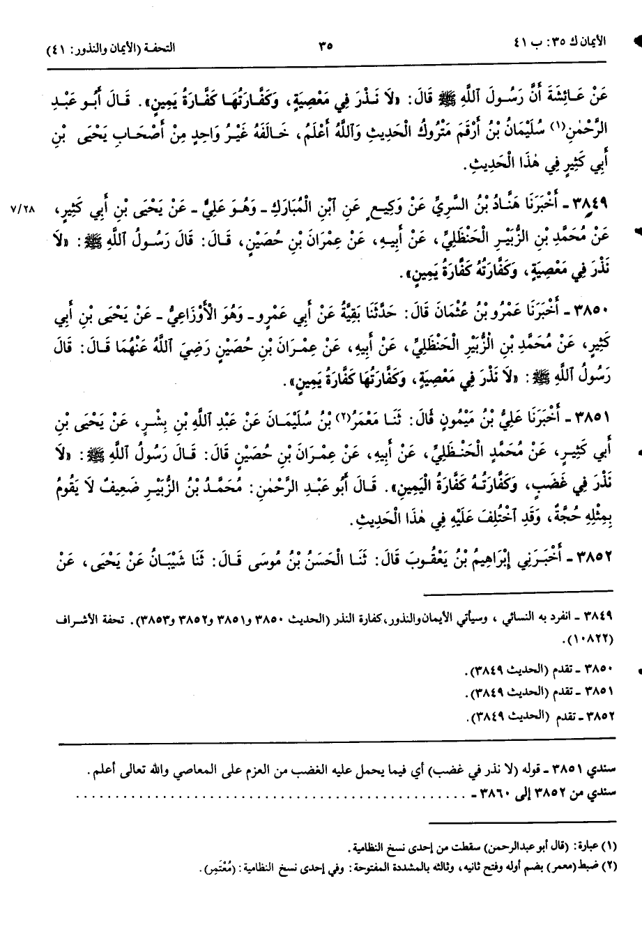 3849 - أَخْبَرَنَا هَنَّادُ بْنُ السَّرِيِّ عَنْ وَكِيعٍ عَنْ ابْنِ الْمُبَارَكِ وَهُوَ عَلِيٌّ عَنْ يَحْيَى بْنِ أَبِي كَثِيرٍ عَنْ مُحَمَّدِ بْنِ الزُّبَيْرِ الْحَنْظَلِيِّ عَنْ أَبِيهِ عَنْ عِمْرَانَ بْنِ حُصَيْنٍ قَالَ قَالَ رَسُولُ اللَّهِ صَلَّى اللَّهُ عَلَيْهِ وَسَلَّمَ لَا نَذْرَ فِي مَعْصِيَةٍ وَكَفَّارَتُهُ كَفَّارَةُ يَمِينٍ