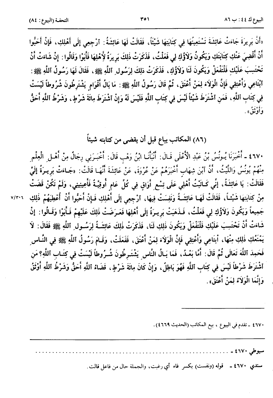 4670 - أَخْبَرَنَا قُتَيْبَةُ بْنُ سَعِيدٍ قَالَ حَدَّثَنَا اللَّيْثُ عَنْ ابْنِ شِهَابٍ عَنْ عُرْوَةَ عَنْ عَائِشَةَ أَخْبَرَتْهُ أَنَّ بَرِيرَةَ جَاءَتْ عَائِشَةَ تَسْتَعِينُهَا فِي كِتَابَتِهَا شَيْئًا فَقَالَتْ لَهَا عَائِشَةُ ارْجِعِي إِلَى أَهْلِكِ فَإِنْ أَحَبُّوا أَنْ أَقْضِيَ عَنْكِ كِتَابَتَكِ وَيَكُونَ وَلَاؤُكِ لِي فَعَلْتُ فَذَكَرَتْ ذَلِكَ بَرِيرَةُ لِأَهْلِهَا فَأَبَوْا وَقَالُوا إِنْ شَاءَتْ أَنْ تَحْتَسِبَ عَلَيْكِ فَلْتَفْعَلْ وَيَكُونَ لَنَا وَلَاؤُكِ فَذَكَرَتْ ذَلِكَ لِرَسُولِ اللَّهِ صَلَّى اللَّهُ عَلَيْهِ وَسَلَّمَ فَقَالَ لَهَا رَسُولُ اللَّهِ صَلَّى اللَّهُ عَلَيْهِ وَسَلَّمَ ابْتَاعِي وَأَعْتِقِي فَإِنَّ الْوَلَاءَ لِمَنْ أَعْتَقَ ثُمَّ قَالَ رَسُولُ اللَّهِ صَلَّى اللَّهُ عَلَيْهِ وَسَلَّمَ مَا بَالُ أَقْوَامٍ يَشْتَرِطُونَ شُرُوطًا لَيْسَتْ فِي كِتَابِ اللَّهِ فَمَنْ اشْتَرَطَ شَيْئًا لَيْسَ فِي كِتَابِ اللَّهِ فَلَيْسَ لَهُ وَإِنْ اشْتَرَطَ مِائَةَ شَرْطٍ وَشَرْطُ اللَّهِ أَحَقُّ وَأَوْثَقُ