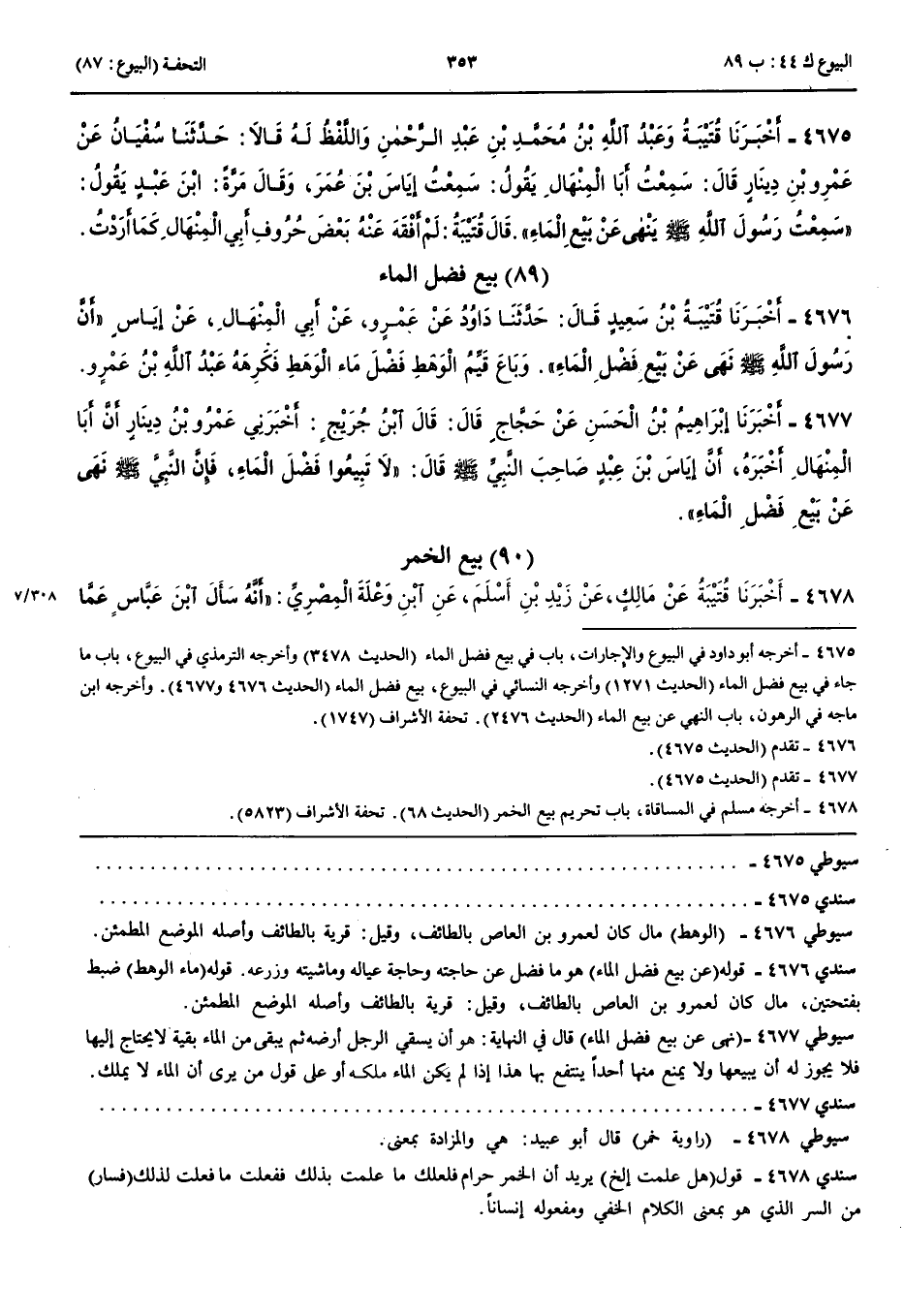 4675 - أَخْبَرَنَا قُتَيْبَةُ وَعَبْدُ اللَّهِ بْنُ مُحَمَّدِ بْنِ عَبْدِ الرَّحْمَنِ وَاللَّفْظُ لَهُ قَالَا حَدَّثَنَا سُفْيَانُ عَنْ عَمْرِو بْنِ دِينَارٍ قَالَ سَمِعْتُ أَبَا الْمِنْهَالِ يَقُولُ سَمِعْتُ إِيَاسَ بْنَ عُمَرَ وَقَالَ مَرَّةً ابْنَ عَبْدٍ يَقُولُ سَمِعْتُ رَسُولَ اللَّهِ صَلَّى اللَّهُ عَلَيْهِ وَسَلَّمَ يَنْهَى عَنْ بَيْعِ الْمَاءِ قَالَ قُتَيْبَةُ لَمْ أَفْقَهْ عَنْهُ بَعْضَ حُرُوفِ أَبِي الْمِنْهَالِ كَمَا أَرَدْتُ
