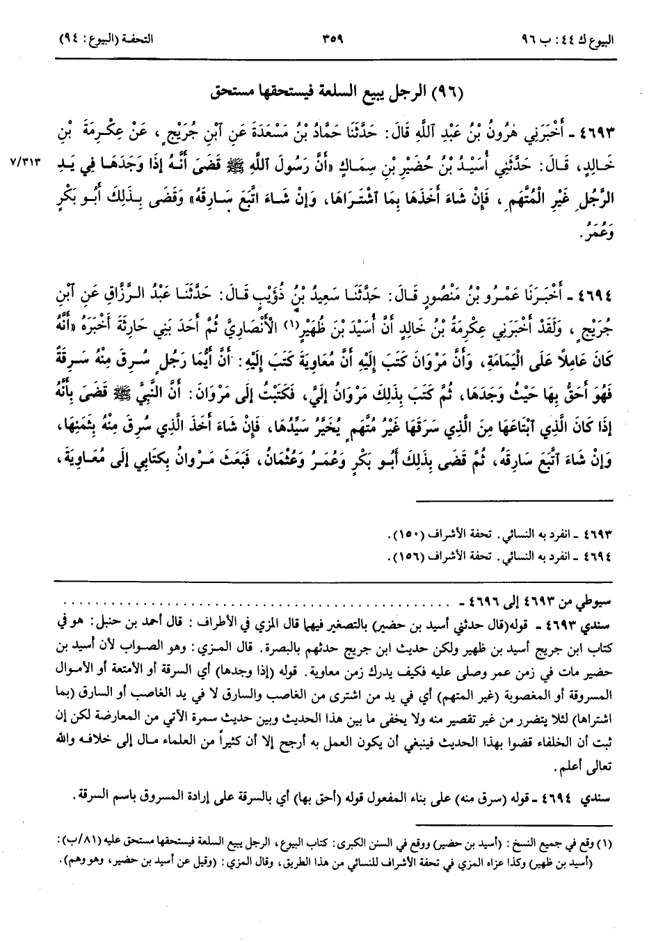 الرَّجُلُ يَبِيعُ السِّلْعَةَ فَيَسْتَحِقُّهَا مُسْتَحِقٌّ 4693 - أَخْبَرَنِي هَارُونُ بْنُ عَبْدِ اللَّهِ قَالَ حَدَّثَنَا حَمَّادُ بْنُ مَسْعَدَةَ عَنْ ابْنِ جُرَيْجٍ عَنْ عِكْرِمَةَ بْنِ خَالِدٍ قَالَ حَدَّثَنِي أُسَيْدُ بْنُ حُضَيْرِ بْنِ سِمَاكٍ أَنَّ رَسُولَ اللَّهِ صَلَّى اللَّهُ عَلَيْهِ وَسَلَّمَ قَضَى أَنَّهُ إِذَا وَجَدَهَا فِي يَدِ الرَّجُلِ غَيْرِ الْمُتَّهَمِ فَإِنْ شَاءَ أَخَذَهَا بِمَا اشْتَرَاهَا وَإِنْ شَاءَ اتَّبَعَ سَارِقَهُ وَقَضَى بِذَلِكَ أَبُو بَكْرٍ وَعُمَرُ