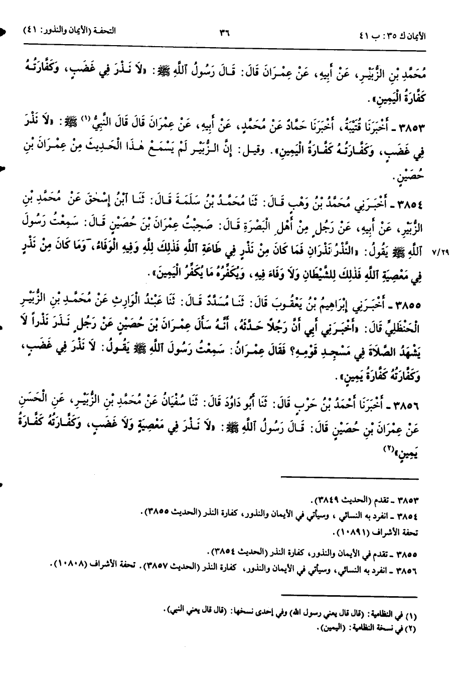 3855 - أَخْبَرَنِي إِبْرَاهِيمُ بْنُ يَعْقُوبَ قَالَ حَدَّثَنَا مُسَدَّدٌ قَالَ حَدَّثَنَا عَبْدُ الْوَارِثِ عَنْ مُحَمَّدِ بْنِ الزُّبَيْرِ الْحَنْظَلِيِّ قَالَ أَخْبَرَنِي أَبِي أَنَّ رَجُلًا حَدَّثَهُ أَنَّهُ سَأَلَ عِمْرَانَ بْنَ حُصَيْنٍ عَنْ رَجُلٍ نَذَرَ نَذْرًا لَا يَشْهَدُ الصَّلَاةَ فِي مَسْجِدِ قَوْمِهِ فَقَالَ عِمْرَانُ سَمِعْتُ رَسُولَ اللَّهِ صَلَّى اللَّهُ عَلَيْهِ وَسَلَّمَ يَقُولُ لَا نَذْرَ فِي غَضَبٍ وَكَفَّارَتُهُ كَفَّارَةُ يَمِينٍ