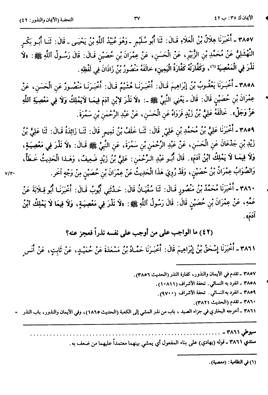 3860 - أَخْبَرَنَا مُحَمَّدُ بْنُ مَنْصُورٍ قَالَ حَدَّثَنَا سُفْيَانُ قَالَ حَدَّثَنِي أَيُّوبُ قَالَ حَدَّثَنَا أَبُو قِلَابَةَ عَنْ عَمِّهِ عَنْ عِمْرَانَ بْنِ حُصَيْنٍ قَالَ قَالَ رَسُولُ اللَّهِ صَلَّى اللَّهُ عَلَيْهِ وَسَلَّمَ لَا نَذْرَ فِي مَعْصِيَةٍ وَلَا فِيمَا لَا يَمْلِكُ ابْنُ آدَمَ