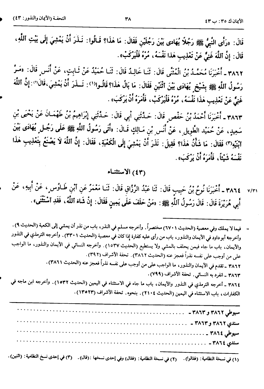 3862 - أَخْبَرَنَا مُحَمَّدُ بْنُ الْمُثَنَّى قَالَ حَدَّثَنَا خَالِدٌ قَالَ حَدَّثَنَا حُمَيْدٌ عَنْ ثَابِتٍ عَنْ أَنَسٍ قَالَ مَرَّ رَسُولُ اللَّهِ صَلَّى اللَّهُ عَلَيْهِ وَسَلَّمَ بِشَيْخٍ يُهَادَى بَيْنَ اثْنَيْنِ فَقَالَ مَا بَالُ هَذَا قَالُوا نَذَرَ أَنْ يَمْشِيَ قَالَ إِنَّ اللَّهَ غَنِيٌّ عَنْ تَعْذِيبِ هَذَا نَفْسَهُ مُرْهُ فَلْيَرْكَبْ فَأَمَرَهُ أَنْ يَرْكَبَ