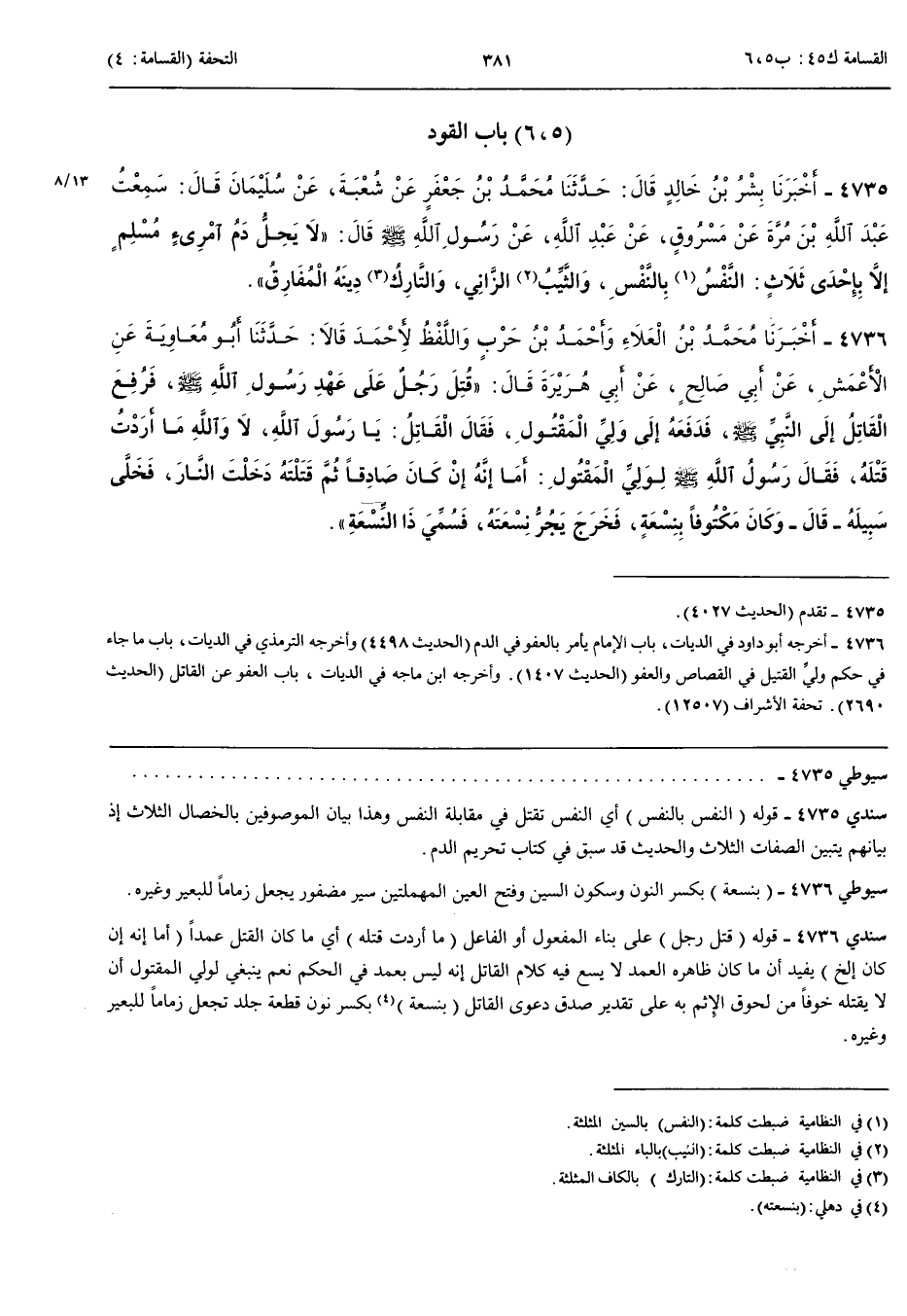 بَاب الْقَوَدِ 4735 - أَخْبَرَنَا بِشْرُ بْنُ خَالِدٍ قَالَ حَدَّثَنَا مُحَمَّدُ بْنُ جَعْفَرٍ عَنْ شُعْبَةَ عَنْ سُلَيْمَانَ قَالَ سَمِعْتُ عَبْدَ اللَّهِ بْنَ مُرَّةَ عَنْ مَسْرُوقٍ عَنْ عَبْدِ اللَّهِ عَنْ رَسُولِ اللَّهِ صَلَّى اللَّهُ عَلَيْهِ وَسَلَّمَ قَالَ لَا يَحِلُّ دَمُ امْرِئٍ مُسْلِمٍ إِلَّا بِإِحْدَى ثَلَاثٍ النَّفْسُ بِالنَّفْسِ وَالثَّيِّبُ الزَّانِي وَالتَّارِكُ دِينَهُ الْمُفَارِقُ