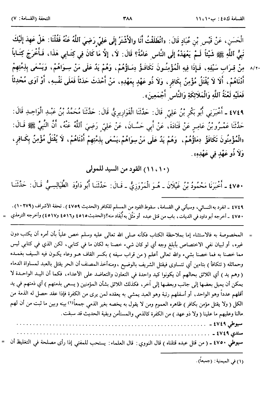4749 - أَخْبَرَنِي أَبُو بَكْرِ بْنُ عَلِيٍّ قَالَ حَدَّثَنَا الْقَوَارِيرِيُّ قَالَ حَدَّثَنَا مُحَمَّدُ بْنُ عَبْدِ الْوَاحِدِ قَالَ حَدَّثَنَا عَمْرُو بْنُ عَامِرٍ عَنْ قَتَادَةَ عَنْ أَبِي حَسَّانَ عَنْ عَلِيٍّ رَضِيَ اللَّهُ عَنْهُ أَنَّ النَّبِيَّ صَلَّى اللَّهُ عَلَيْهِ وَسَلَّمَ قَالَ الْمُؤْمِنُونَ تَكَافَأُ دِمَاؤُهُمْ وَهُمْ يَدٌ عَلَى مَنْ سِوَاهُمْ يَسْعَى بِذِمَّتِهِمْ أَدْنَاهُمْ لَا يُقْتَلُ مُؤْمِنٌ بِكَافِرٍ وَلَا ذُو عَهْدٍ فِي عَهْدِهِ