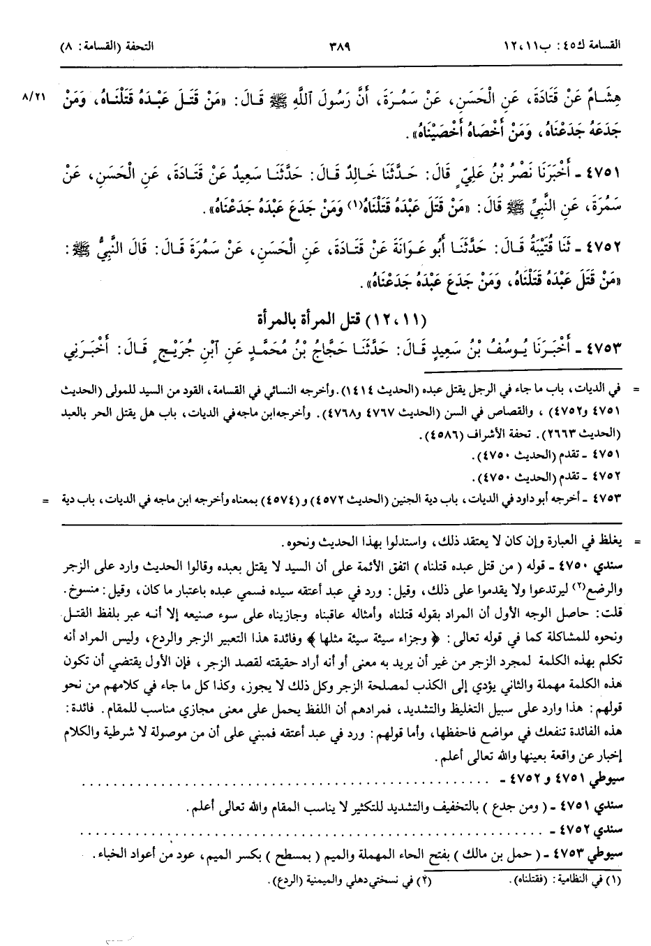 4751 - أَخْبَرَنَا نَصْرُ بْنُ عَلِيٍّ قَالَ حَدَّثَنَا خَالِدٌ قَالَ حَدَّثَنَا سَعِيدٌ عَنْ قَتَادَةَ عَنْ الْحَسَنِ عَنْ سَمُرَةَ عَنْ النَّبِيِّ صَلَّى اللَّهُ عَلَيْهِ وَسَلَّمَ قَالَ مَنْ قَتَلَ عَبْدَهُ قَتَلْنَاهُ وَمَنْ جَدَعَ عَبْدَهُ جَدَعْنَاهُ