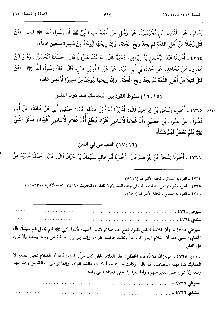 سُقُوطُ الْقَوَدِ بَيْنَ الْمَمَالِيكِ فِيمَا دُونَ النَّفْسِ 4765 - أَخْبَرَنَا إِسْحَقُ بْنُ إِبْرَاهِيمَ قَالَ أَنْبَأَنَا مُعَاذُ بْنُ هِشَامٍ قَالَ حَدَّثَنِي أَبِي عَنْ قَتَادَةَ عَنْ أَبِي نَضْرَةَ عَنْ عِمْرَانَ بْنِ حُصَيْنٍ أَنَّ غُلَامًا لِأُنَاسٍ فُقَرَاءَ قَطَعَ أُذُنَ غُلَامٍ لِأُنَاسٍ أَغْنِيَاءَ فَأَتَوْا النَّبِيَّ صَلَّى اللَّهُ عَلَيْهِ وَسَلَّمَ فَلَمْ يَجْعَلْ لَهُمْ شَيْئًا