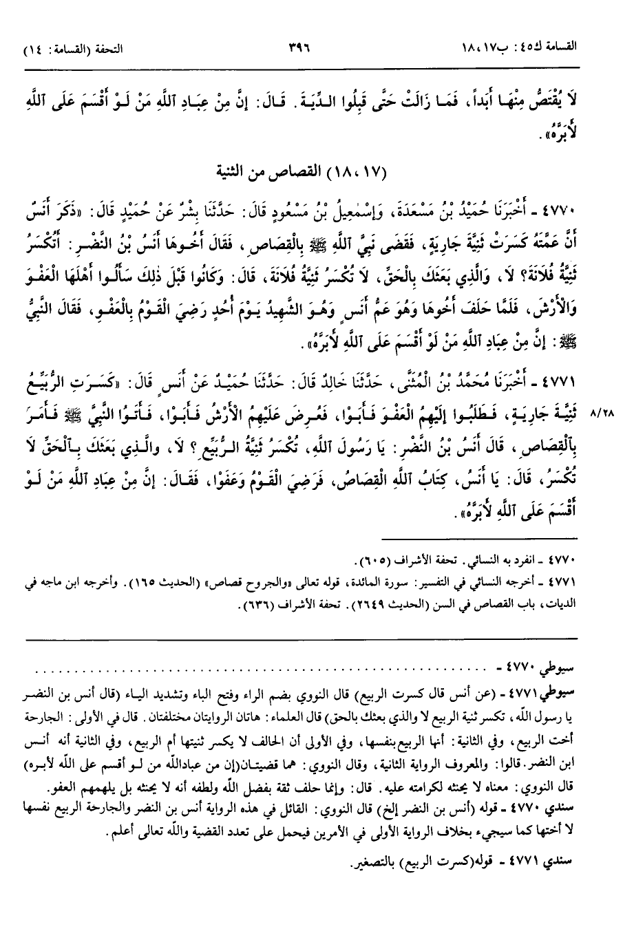 الْقِصَاصُ مِنْ الثَّنِيَّةِ 4770 - أَخْبَرَنَا حُمَيْدُ بْنُ مَسْعَدَةَ وَإِسْمَعِيلُ بْنُ مَسْعُودٍ قَالَ حَدَّثَنَا بِشْرٌ عَنْ حُمَيْدٍ قَالَ ذَكَرَ أَنَسٌ أَنَّ عَمَّتَهُ كَسَرَتْ ثَنِيَّةَ جَارِيَةٍ فَقَضَى نَبِيُّ اللَّهِ صَلَّى اللَّهُ عَلَيْهِ وَسَلَّمَ بِالْقِصَاصِ فَقَالَ أَخُوهَا أَنَسُ بْنُ النَّضْرِ أَتُكْسَرُ ثَنِيَّةُ فُلَانَةَ لَا وَالَّذِي بَعَثَكَ بِالْحَقِّ لَا تُكْسَرُ ثَنِيَّةُ فُلَانَةَ قَالَ وَكَانُوا قَبْلَ ذَلِكَ سَأَلُوا أَهْلَهَا الْعَفْوَ وَالْأَرْشَ فَلَمَّا حَلَفَ أَخُوهَا وَهُوَ عَمُّ أَنَسٍ وَهُوَ الشَّهِيدُ يَوْمَ أُحُدٍ رَضِيَ الْقَوْمُ بِالْعَفْوِ فَقَالَ النَّبِيُّ صَلَّى اللَّهُ عَلَيْهِ وَسَلَّمَ إِنَّ مِنْ عِبَادِ اللَّهِ مَنْ لَوْ أَقْسَمَ عَلَى اللَّهِ لَأَبَرَّهُ