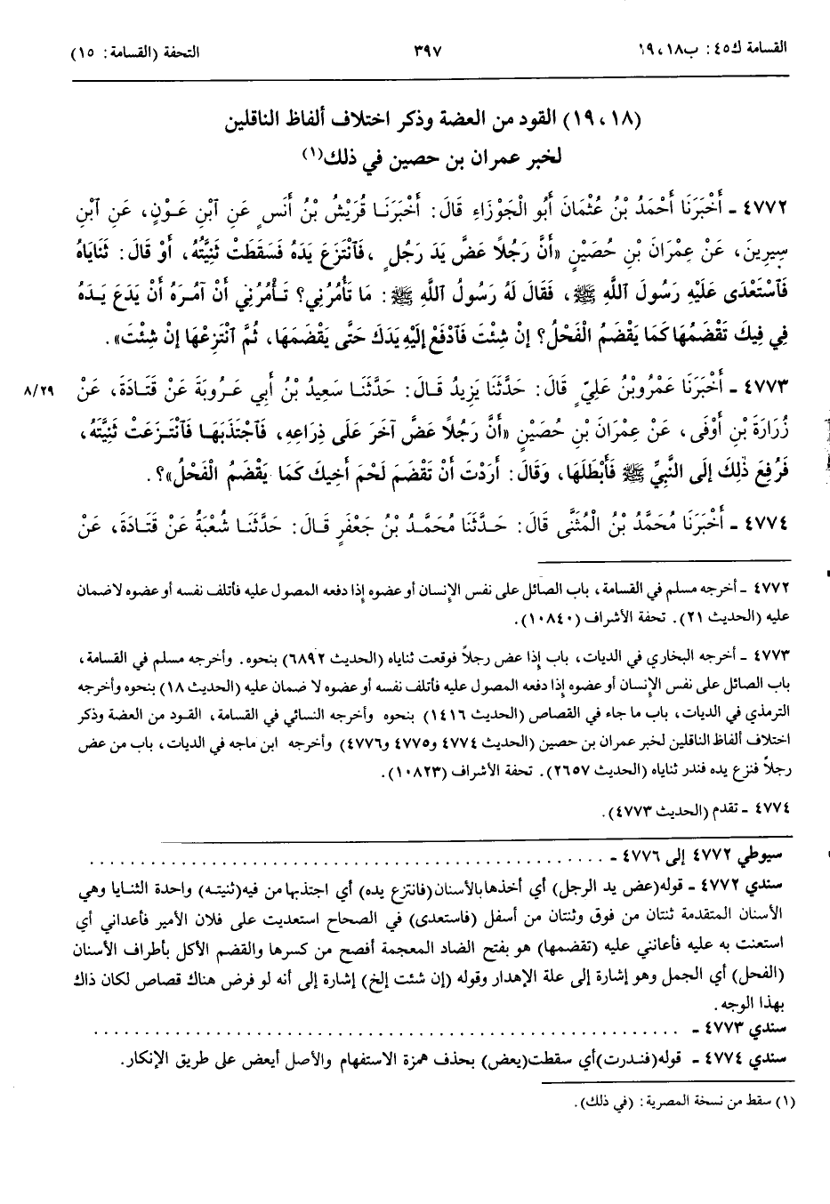 الْقَوَدُ مِنْ الْعَضَّةِ وَذِكْرُ اخْتِلَافِ أَلْفَاظِ النَّاقِلِينَ لِخَبَرِ عِمْرَانَ بْنِ حُصَيْنٍ 4772 - أَخْبَرَنَا أَحْمَدُ بْنُ عُثْمَانَ أَبُو الْجَوْزَاءِ قَالَ أَنْبَأَنَا قُرَيْشُ بْنُ أَنَسٍ عَنْ ابْنِ عَوْنٍ عَنْ ابْنِ سِيرِينَ عَنْ عِمْرَانَ بْنِ حُصَيْنٍ أَنَّ رَجُلًا عَضَّ يَدَ رَجُلٍ فَانْتَزَعَ يَدَهُ فَسَقَطَتْ ثَنِيَّتُهُ أَوْ قَالَ ثَنَايَاهُ فَاسْتَعْدَى عَلَيْهِ رَسُولَ اللَّهِ صَلَّى اللَّهُ عَلَيْهِ وَسَلَّمَ فَقَالَ لَهُ رَسُولُ اللَّهِ صَلَّى اللَّهُ عَلَيْهِ وَسَلَّمَ مَا تَأْمُرُنِي تَأْمُرُنِي أَنْ آمُرَهُ أَنْ يَدَعَ يَدَهُ فِي فِيكَ تَقْضَمُهَا كَمَا يَقْضَمُ الْفَحْلُ إِنْ شِئْتَ فَادْفَعْ إِلَيْهِ يَدَكَ حَتَّى يَقْضَمَهَا ثُمَّ انْتَزِعْهَا إِنْ شِئْتَ