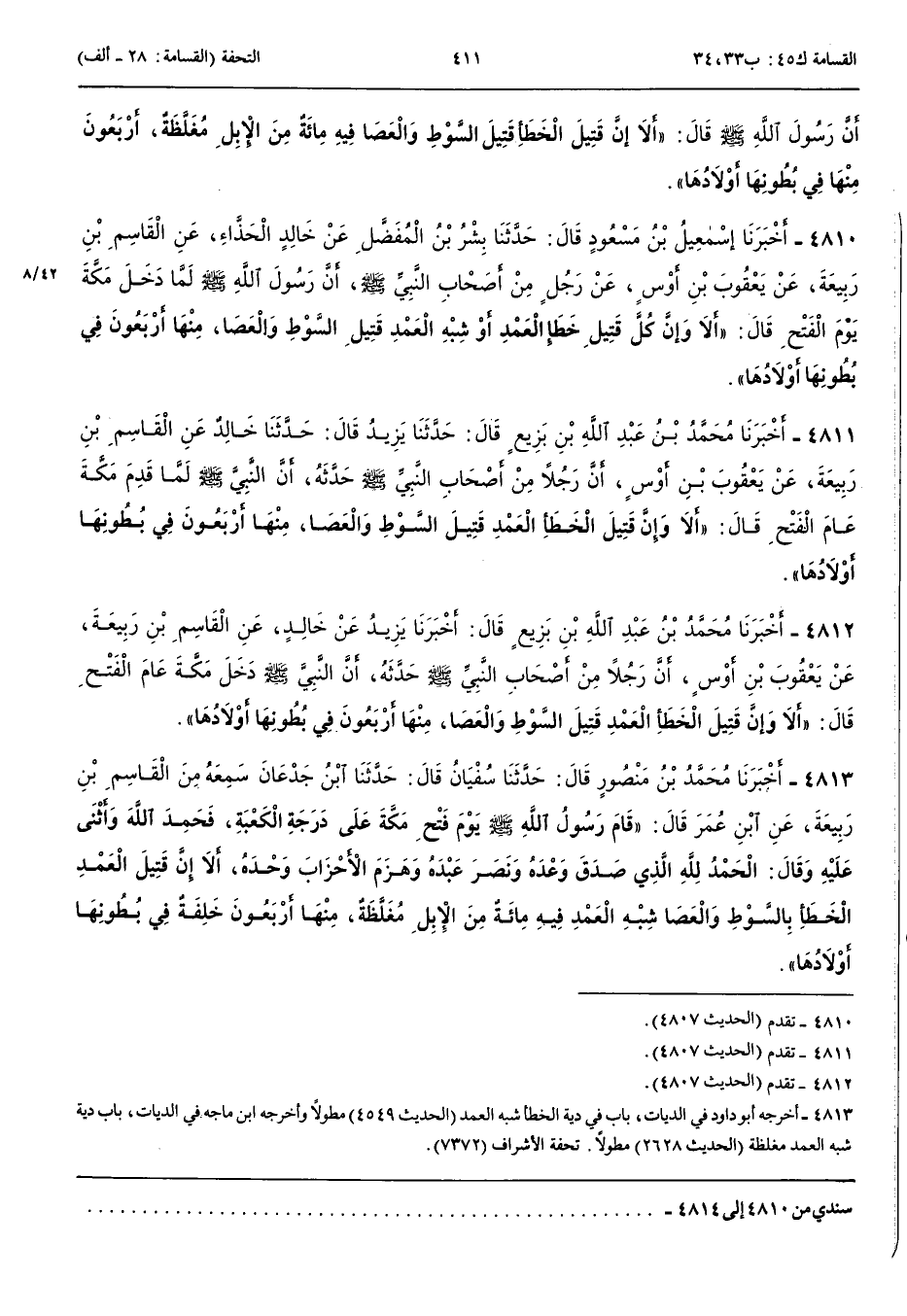 4811 - أَخْبَرَنَا مُحَمَّدُ بْنُ عَبْدِ اللَّهِ بْنِ بَزِيعٍ قَالَ حَدَّثَنَا يَزِيدُ قَالَ حَدَّثَنَا خَالِدٌ عَنْ الْقَاسِمِ بْنِ رَبِيعَةَ عَنْ يَعْقُوبَ بْنِ أَوْسٍ أَنَّ رَجُلًا مِنْ أَصْحَابِ النَّبِيِّ صَلَّى اللَّهُ عَلَيْهِ وَسَلَّمَ حَدَّثَهُ أَنَّ رَسُولَ اللَّهِ صَلَّى اللَّهُ عَلَيْهِ وَسَلَّمَ لَمَّا قَدِمَ مَكَّةَ عَامَ الْفَتْحِ قَالَ أَلَا وَإِنَّ قَتِيلَ الْخَطَإِ الْعَمْدِ قَتِيلَ السَّوْطِ وَالْعَصَا مِنْهَا أَرْبَعُونَ فِي بُطُونِهَا أَوْلَادُهَا