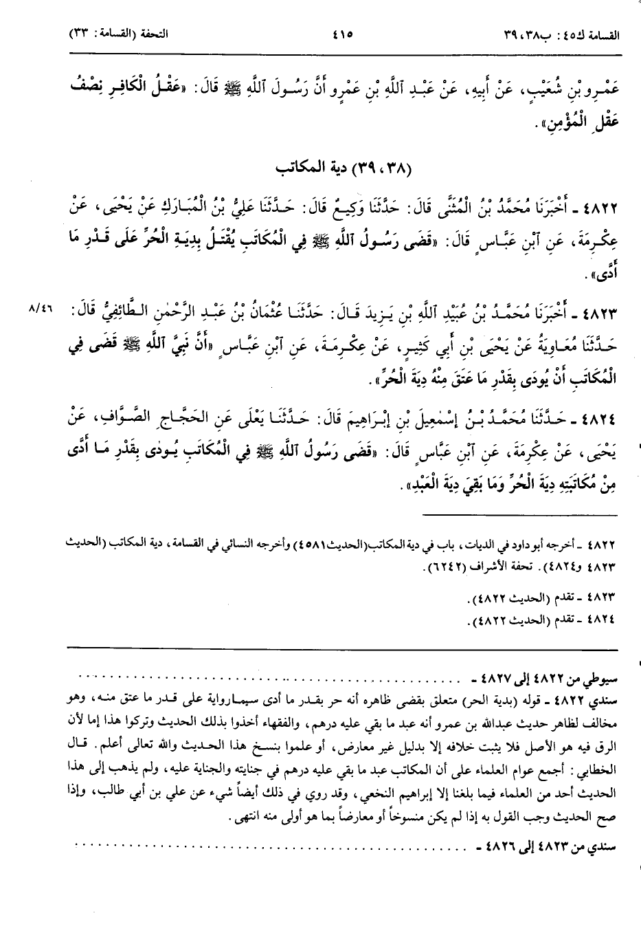 دِيَةُ الْمُكَاتَبِ 4822 - أَخْبَرَنَا مُحَمَّدُ بْنُ الْمُثَنَّى قَالَ حَدَّثَنَا وَكِيعٌ قَالَ حَدَّثَنَا عَلِيُّ بْنُ الْمُبَارَكِ عَنْ يَحْيَى عَنْ عِكْرِمَةَ عَنْ ابْنِ عَبَّاسٍ قَالَ قَضَى رَسُولُ اللَّهِ صَلَّى اللَّهُ عَلَيْهِ وَسَلَّمَ فِي الْمُكَاتَبِ يُقْتَلُ بِدِيَةِ الْحُرِّ عَلَى قَدْرِ مَا أَدَّى